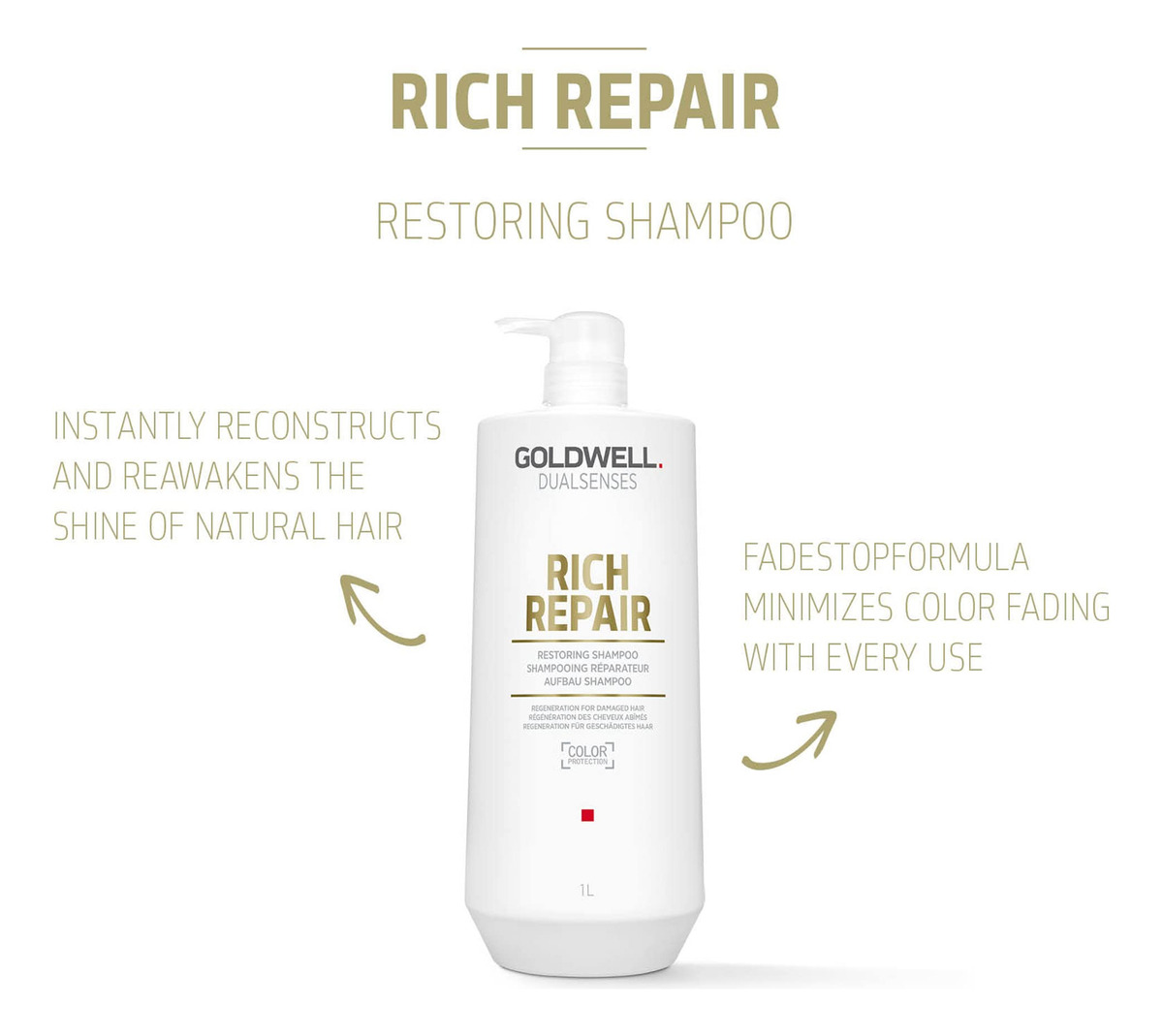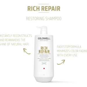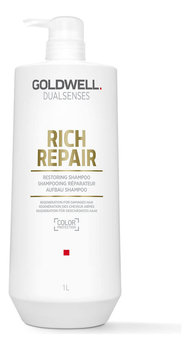 Shampoo restaurador Goldwell Dualsenses Rich Repair 1L – Ajuda a equilibrar efetivamente os níveis de lipídios dentro e na superfície do cabelo – Este shampoo remove suavemente as impurezas enquanto repara e reabastece o cabelo – Deixa o cabelo macio, suave, brilhante e com aparência saudável