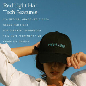 Eleve sua rotina de cuidados com o cabelo com o chapéu Red Light HigherDose, projetado para melhorar a saúde do seu cabelo. Essa tecnologia inovadora de bem-estar combina terapia avançada de luz vermelha com um design confortável e fácil de usar, promovendo cabelos mais saudáveis e com aparência mais cheia. Experimente os benefícios da terapia com luz vermelha, conhecida por estimular os folículos capilares e melhorar a saúde do couro cabeludo, tudo com a conveniência de um chapéu. Incorpore este dispositivo de ponta em sua rotina diária para aumentar a força e a vitalidade de seus cabelos. Descubra o futuro do bem-estar capilar com o chapéu Red Light HigherDose. – Melhore a saúde do seu cabelo – Revitalize o couro cabeludo e apoie o crescimento saudável do cabelo com o poder da luz vermelha de 650 nm. Cabelo saudável e sexy começa na raiz. – Couro cabeludo saudável, cabelo saudável – A terapia com luz vermelha infravermelha apoia a saúde da pele do couro cabeludo, promovendo um ambiente forte para o crescimento potencial do cabelo. Uma saúde mais forte do couro cabeludo ajuda o cabelo a crescer mais forte, suportando menos queda e fortalecendo o cabelo na raiz. – Cresça – A terapia com luz LED estimula o couro cabeludo, ajudando a promover mais transporte de oxigênio e nutrientes para os folículos pilosos. As luzes vermelhas podem estimular a produção de ATP (trifosfato de adenosina), promovendo a regeneração e o reparo celular. – Design funcional – Esse design sem fio torna a integração dos cuidados com o cabelo fácil e sem esforço em qualquer estilo de vida. Use este tratamento de couro cabeludo diariamente por apenas 10 minutos por 16 semanas e, em seguida, faça um tratamento de manutenção regular de 3 a 4 vezes por semana. – Bem-vindo ao High Life – Acreditamos que a saúde é o maior luxo e o bem-estar é um investimento que continua a crescer com o tempo. Somos apaixonados por criar as ferramentas de autocuidado mais eficazes para aumentar a longevidade e a vitalidade, além de educar nossa comunidade sobre seus poderosos benefícios. HigherDose tem tudo a ver com voltar ao poder curativo da natureza e priorizar nos sentirmos bem, de dentro para fora.