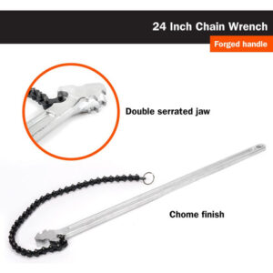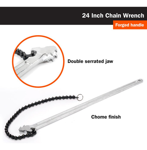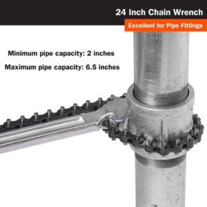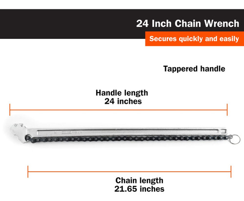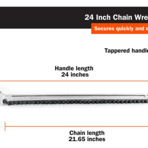 Chave de corrente Titan Tools 21372 de 24 polegadas – Chave de corrente de alça de 24" com alça e mandíbula de aço carbono forjado de peça única – A mandíbula serrilhada dupla permite uma ação rápida, giratória e bidirecional – Comprimento da corrente: 21,65" (550 mm) – Capacidade mínima do tubo: 2" (50 mm) – Capacidade máxima do tubo: 6,5" (165 mm)