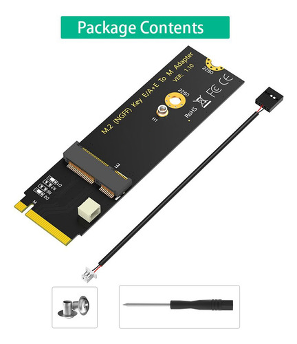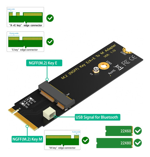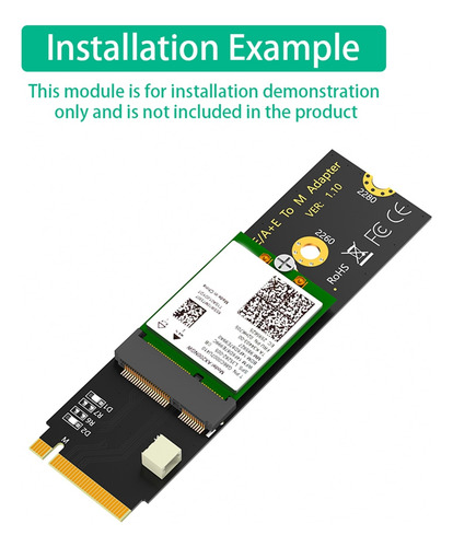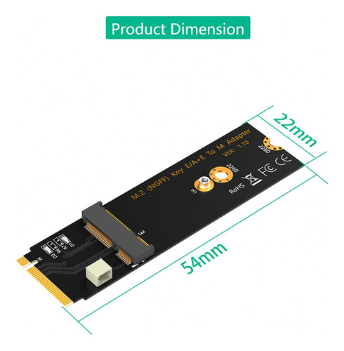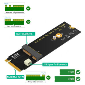 Características do produto: 1. Converta um módulo M.2 E Key ou A-E Key (como WiFi ou módulo sem fio de banda dupla, etc.) para ser usado em um computador com soquete M Key M.2. 2. Suporta WiFi 2230/3030 M.2 E Key e A-E Key e módulo sem fio de banda dupla