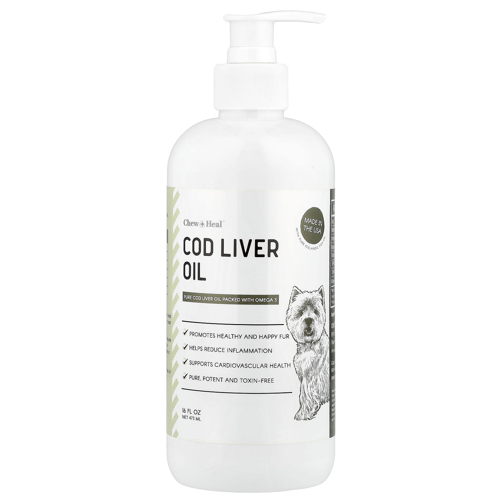 Chew + Heal Óleo de Fígado de Bacalhau 473 ml (16 fl oz) – Chew + Heal Pets Suplementos para pets Suplementos para cães Ômegas e óleos para cães.