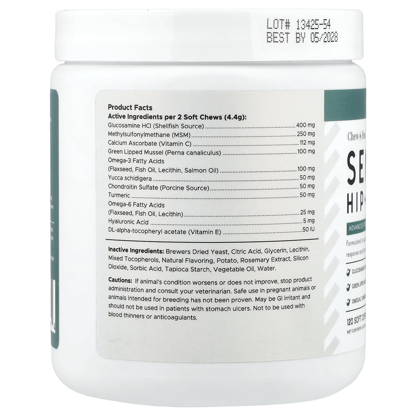 Chew + Heal Quadril e Articulações Sênior Para Cães 120 Cápsulas Mastigáveis 264 g (93 oz) – Chew + Heal Pets Suplementos para pets Suplementos para cães Apoio para quadril e articulações de cães.