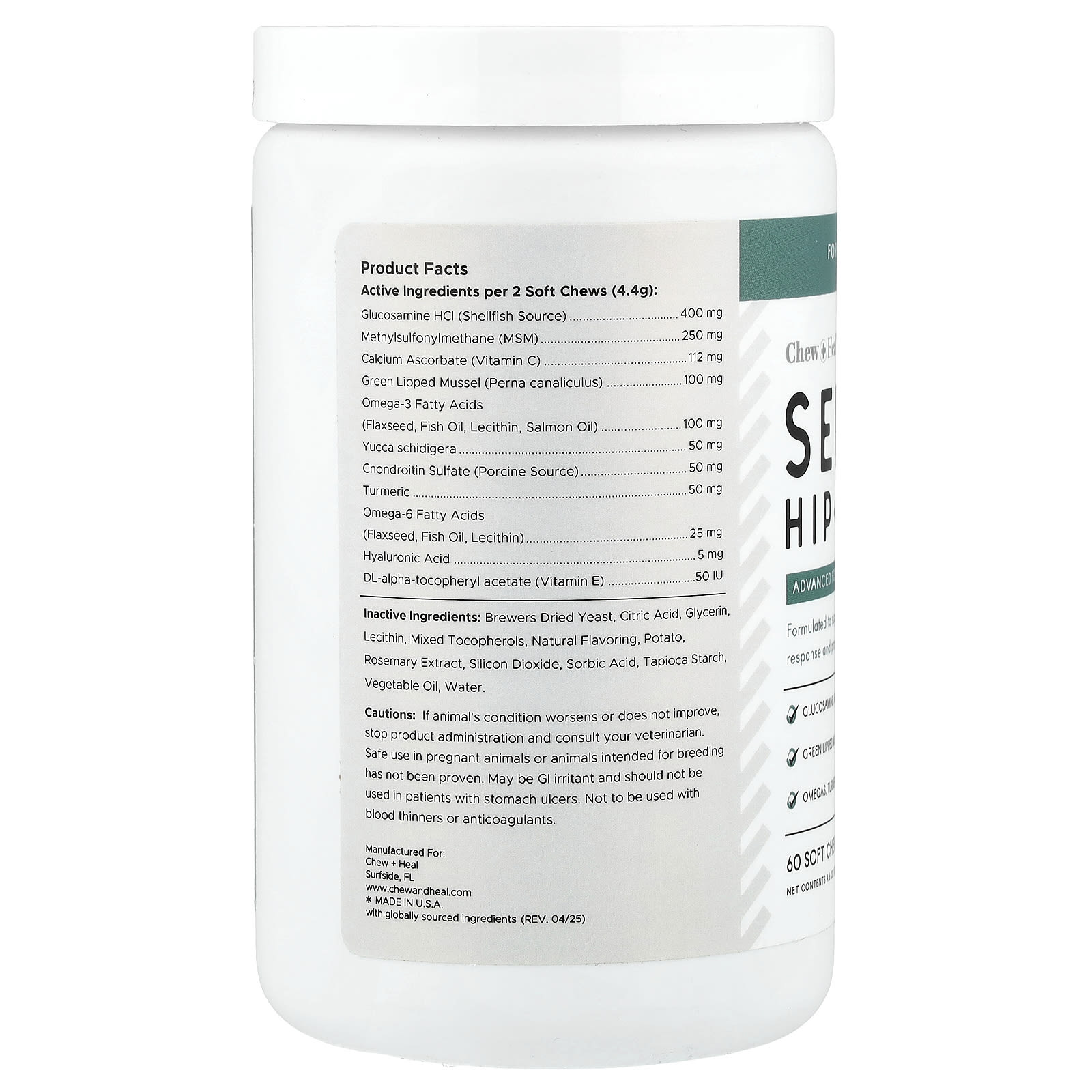 Chew + Heal Quadril e Articulações Sênior Para Cães 60 Cápsulas Mastigáveis 132 g (46 oz) – Chew + Heal Pets Suplementos para pets Suplementos para cães Apoio para quadril e articulações de cães.