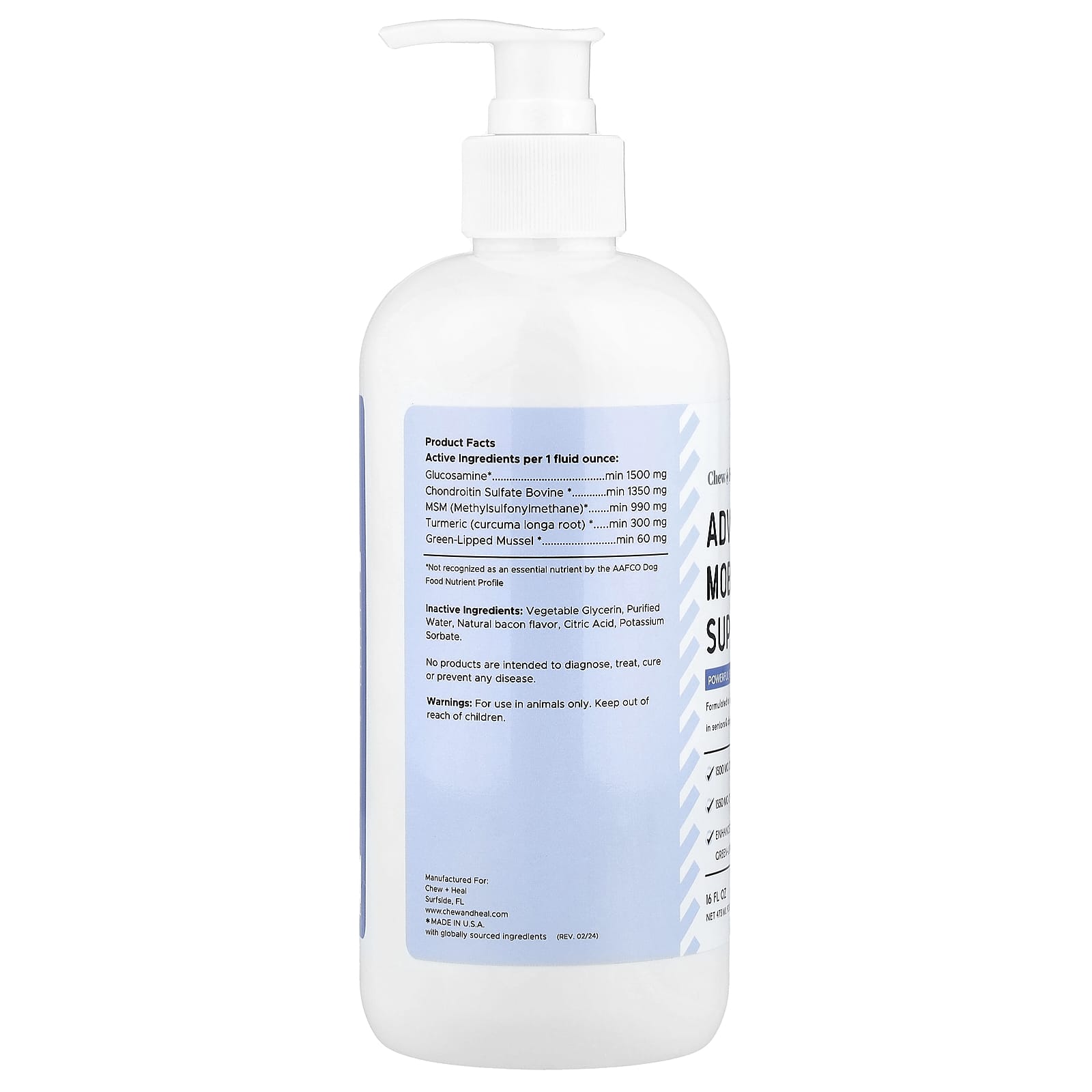 Chew + Heal Suporte Avançado para a Mobilidade Para Cães 473 ml (16 fl oz) – Chew + Heal Pets Suplementos para pets Suplementos para cães Apoio para quadril e articulações de cães.