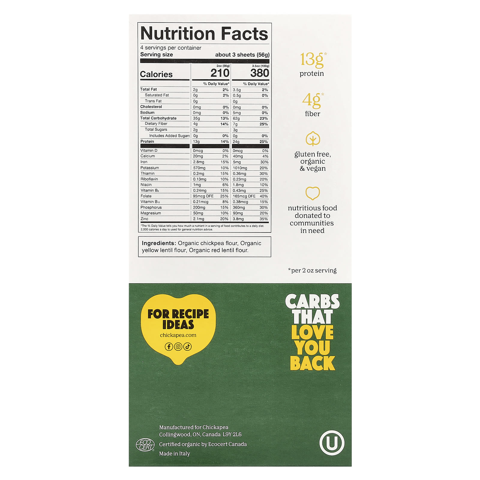 Chickapea Lasanha Orgânica 227 g (8 oz) – Chickapea Alimentos Alimentos embalados e prontos Massas e Macarrão.