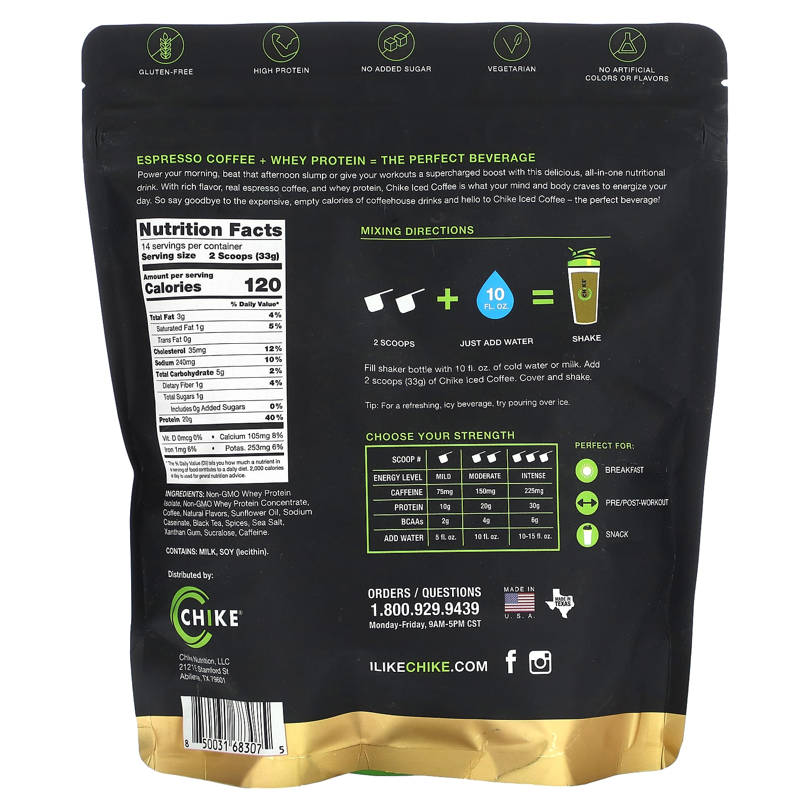 Fortaleça sua manhã, supere a depressão da tarde ou dê um reforço adicional em seus treinos com esta deliciosa bebida nutricional completa. Com sabor rico, café expresso de verdade e proteína whey, o Chike Iced Coffee é o que sua mente e seu corpo desejam para energizar o seu dia. Portanto, diga adeus às calorias caras e vazias das bebidas de uma cafeteria e olá ao Chike Iced Coffee – a bebida perfeita!