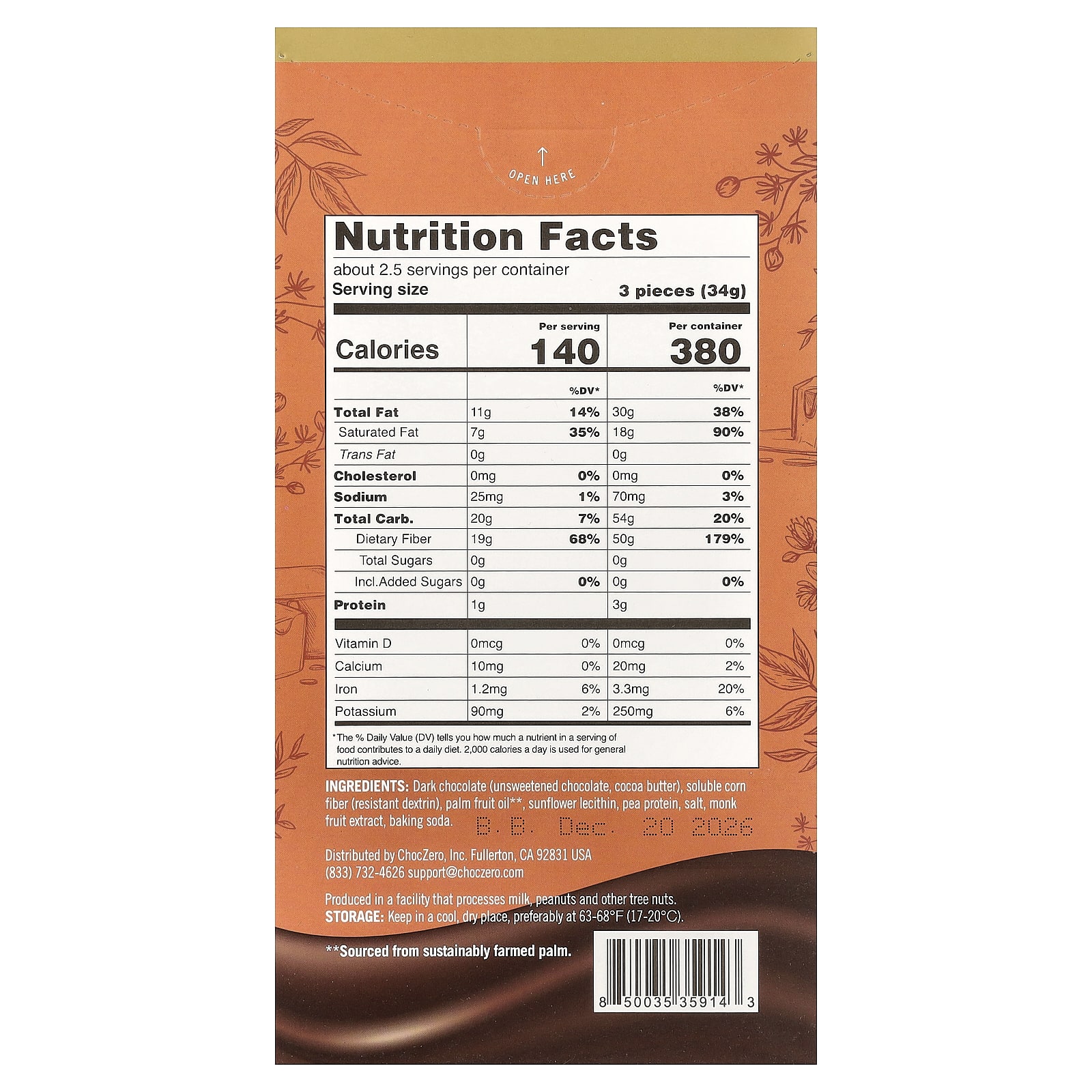 Chocolate amargo (chocolate sem açúcar, manteiga de cacau), fibra de milho solúvel (dextrina resistente), óleo de palma**, lecitina de girassol, proteína de ervilha, sal, extrato de fruta do monge, bicarbonato de sódio.