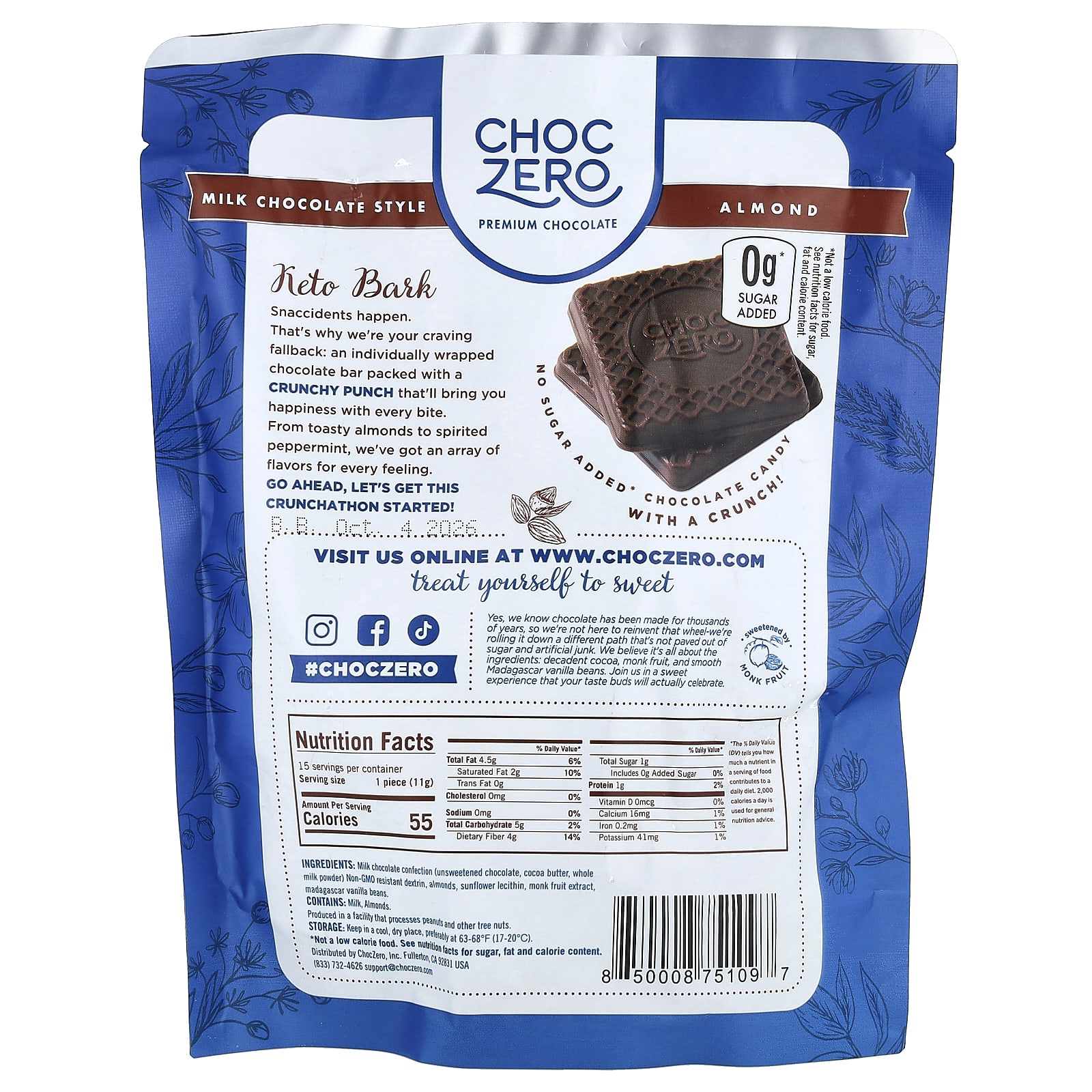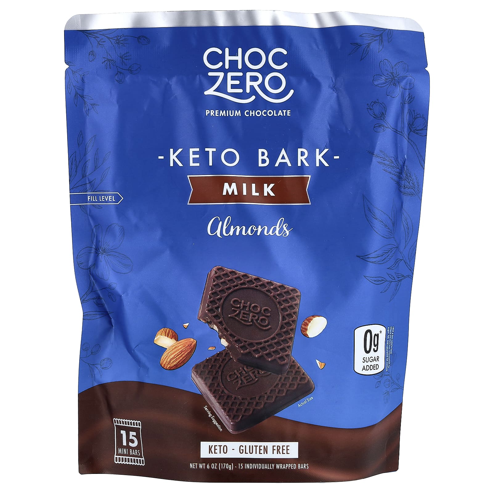 ChocZero Casca Cetogênica Chocolate ao Leite Amêndoa 15 MiniBarras 170 g (6 oz) – ChocZero Alimentos Chocolate e doces Chocolate Chocolate ao leite.