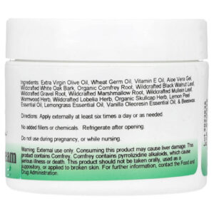 Somente para uso externo. O consumo deste produto pode causar danos ao fígado. Este produto contém confrei. O confrei contém alcaloides pirrolizidínicos que podem causar doenças graves ou morte. Este produto não deve ser tomado por via oral, usado como supositório ou aplicado na pele machucada. Para obter mais informações, entre em contato com a Food and Drug Administration.