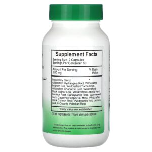 | Mistura Patenteada Raiz de Hortênsia Silvestre, Chá de Brigham Silvestre, Raiz de Yucca Silvestre, Folha de Chaparral Silvestre, Folha de Nogueira Preta Silvestre, Erva de Lobélia Silvestre, Raiz de Bardana, Raiz de Sarsaparrilha, Erva de Absinto, Pimenta Caiena (40 MHU), Raiz de Cohosh Preta Silvestre, Alface Silvestre Raiz de Valeriana Orgânica |