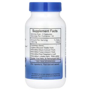 | Mistura Patenteada: Erva de Cardo-santo Orgânico, Raiz de Acteia Silvestre, Raiz de Falso Unicórnio Silvestre, Folha de Framboesa Vermelha Silvestre, Erva Lobélia Silvestre, Erva Mitchella repens Silvestre e Erva Poejo Silvestre |