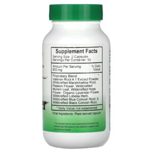 | Mistura Patenteada: Extrato em Pó 4: 1 da Raiz de Valeriana, Raiz de Marshmallow Silvestre, Flor da Paixão, Folha de Verbasco Silvestre, Flor de Lúpulo Silvestre, Flor de Lavanda Orgânica, Erva de Lobélia Silvestre, Raiz de Cohosh Azul Silvestre e Raiz de Cohosh Preto Silvestre. |