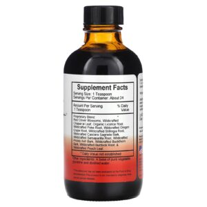 | Mistura Patenteada: Flores de Trevo Vermelho, Folha de Chaparral Silvestre, Raiz de Alcaçuz Orgânico, Raiz de Espinhoso Silvestre, Raiz de Uva de Oregon Silvestre, Raiz de Stillingia Silvestre, Casca Sagrada de Casca Silvestre, Raiz de Salsaparrilha Silvestre, Casca de Cinza Espinhosa Silvestre, Casca de Buckthorn Silvestre, Raiz de Bardana Silvestre e Pêssego Silvestre Folha |