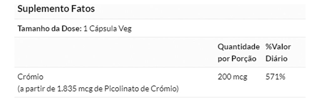 5. Elementos da Composição: Formulado com Chromium Picolinate de alta qualidade, este produto oferece uma dose concentrada de cromo, um mineral essencial para auxiliar no metabolismo da glicose. Validade longa