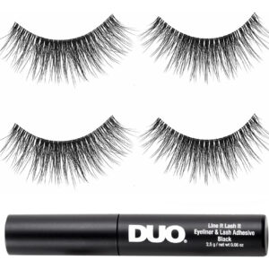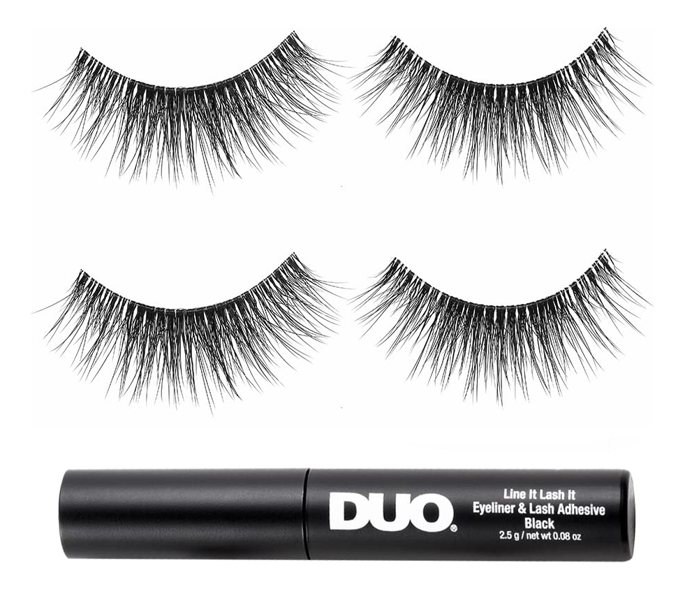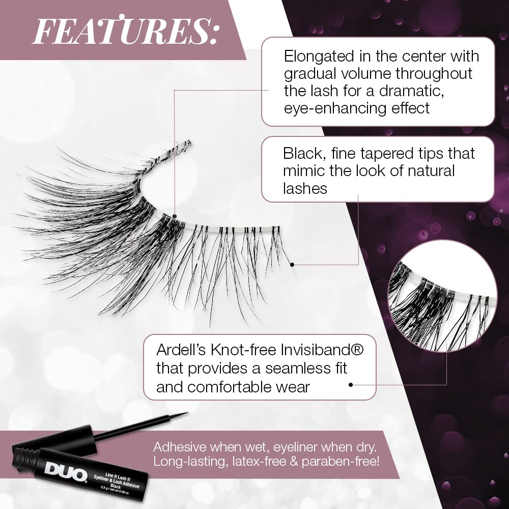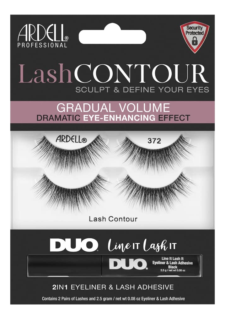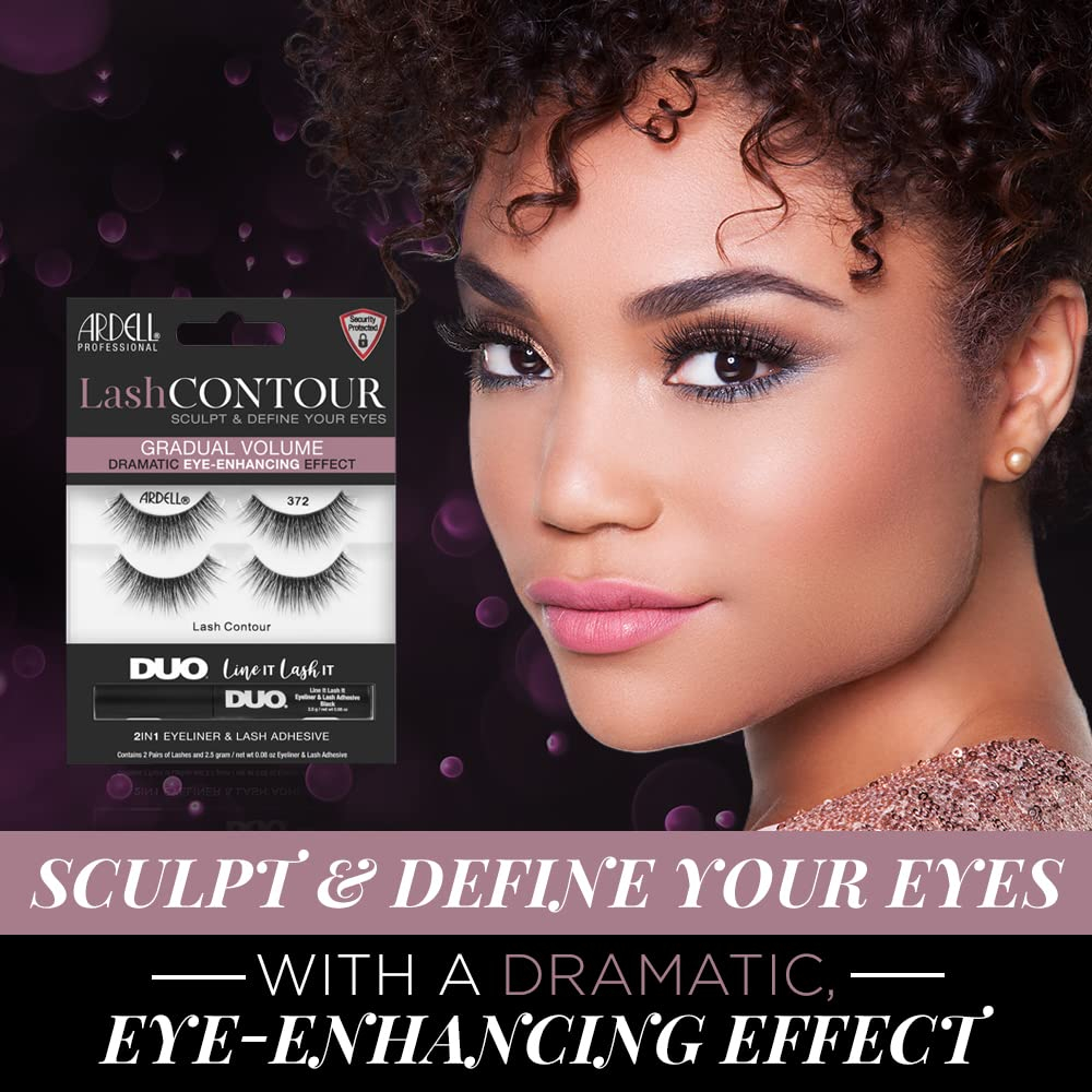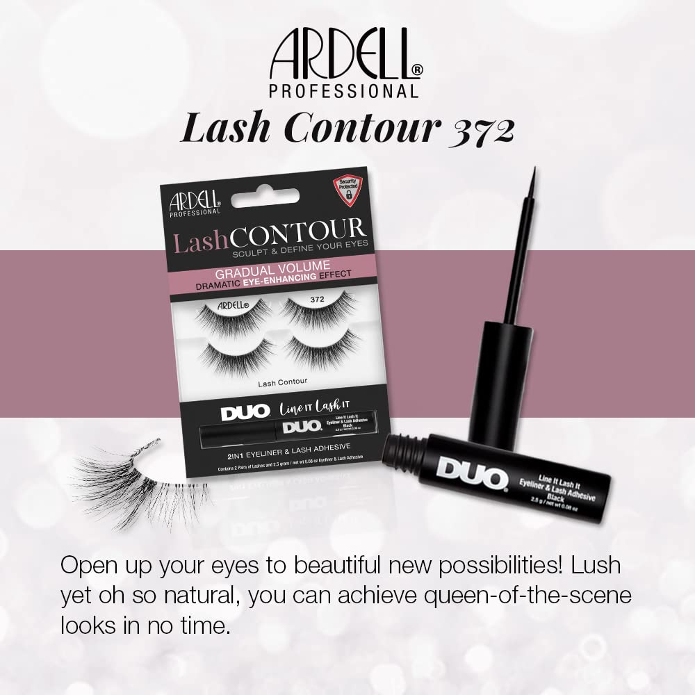 Ardell Lash Contour 372, volume gradual, efeito dramático de aprimoramento dos olhos com adesivo preto DUO Line It Lash It, 2 pares — Excelente formato e design dos cílios: apresentam contornos e definem o estilo dos cílios para aprimorar a aparência dos cílios; aprimora a forma e a cor dos olhos para um efeito de cílios mais dramático; cílios mais ousados e marcantes sem parecerem exagerados — Volume equilibrado e moderado: recheado com mais fibras pretas que se misturam naturalmente com seus cílios reais; as fibras são cuidadosamente espalhadas em toda a faixa para uma aparência equilibrada e espessa; parecem e se sentem como se estivessem naturalmente sua; confortável e não pesada nas pálpebras — Fibras pretas de comprimento médio: feitas com fibras naturalmente leves que se misturam com seus cílios reais; fibras dispostas em comprimentos iguais, criando um conjunto completo de cílios; cílios limpos e preparados para complementar qualquer look; confortáveis e não parecem falsos — Pulseira de cílios transparente e confiável: em parceria com a famosa Invisband da Ardell para fixar perfeitamente os cílios em seus pálpebras; transição impecável das pálpebras até as pontas dos cílios; acabamento e uso confortáveis e sem complicações — Ótima relação custo/benefício: cada pacote vem com 2 pares de Lash Contour 32 e Line It e Lash It Duo pretos; contém um adesivo para cílios e um forro preto em um; dois pares para garantir que você não fique sem estoque; não é necessário comprar e experimentar seus itens essenciais para cílios separadamente