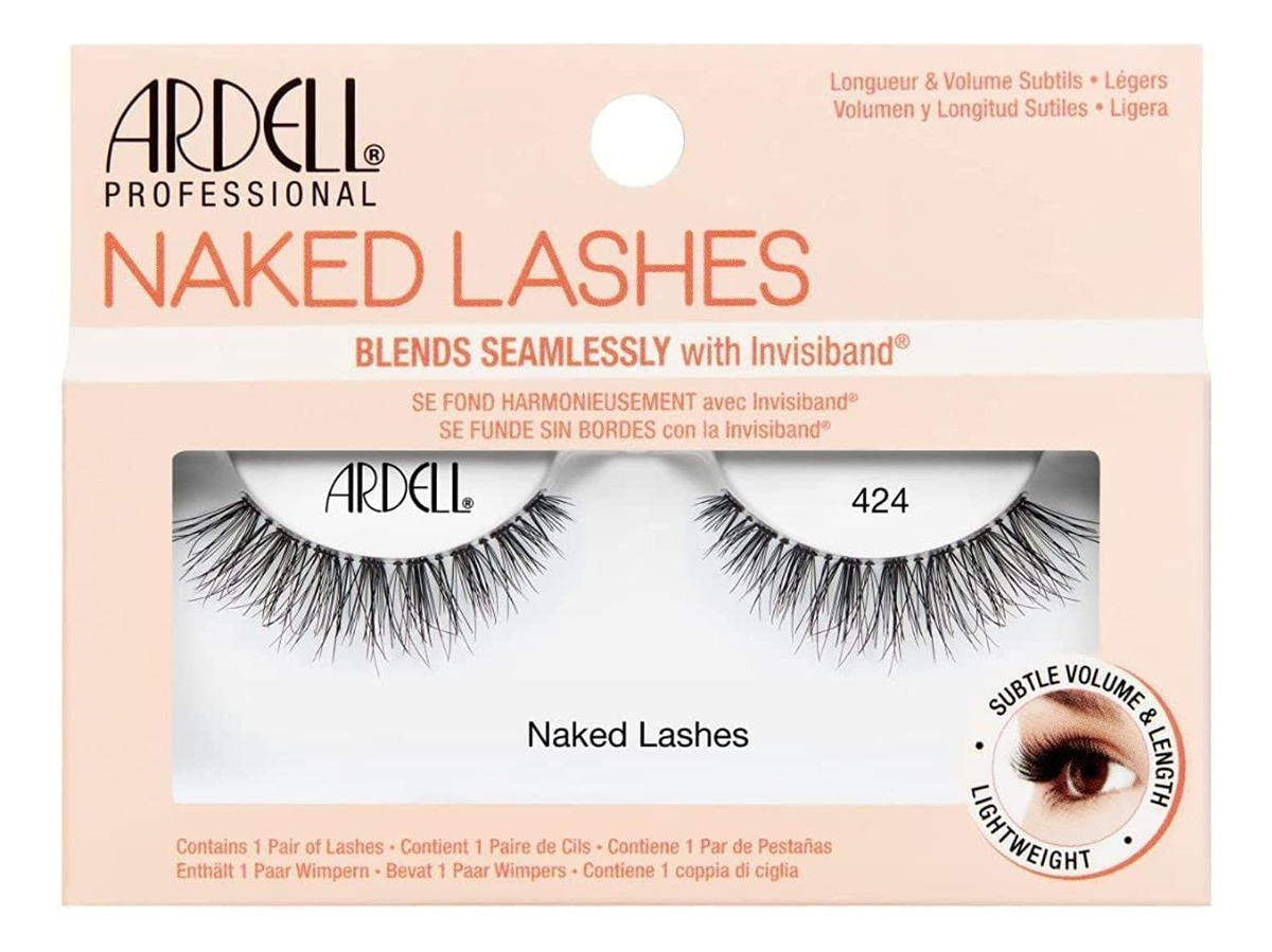 Naked Lashes 424 — Cílios macios e leves: a coleção de cílios de estilo natural da Ardell que adiciona a quantidade certa de volume e comprimento sutis para uso diário; fibras pretas de comprimento médio com cachos de aparência natural; silhueta de cílios arredondada com número alternado de cachos; adaptada às pontas e combina perfeitamente com seus cílios reais; termina com um acabamento muito natural; ótima com ou sem rímel combinada; com a confortável e transparente Invisiband da Ardell