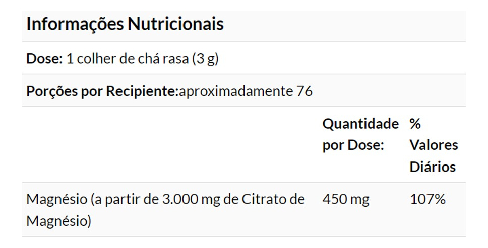 5. Composição Pura e Concentrada: Cada porção deste produto contém Citrato de Magnésio puro, proporcionando uma forma altamente absorvível de magnésio. Sem aditivos ou conservantes, oferece um suplemento puro e eficaz para sua rotina diária. VALIDADE LONGA