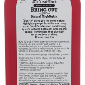O clareador de cabelo Sun-In Tropical Breeze dá ao seu cabelo a aparência que você sempre quis. Sun In é a maneira rápida e fácil de obter cabelos bonitos e mais claros. Basta borrifá-lo. Ele começa a funcionar com apenas um aplicativo. E é fácil, basta borrifar e deixar o calor do sol ou de um secador de cabelo fazer o trabalho! Não há maneira mais fácil de obter uma aparência mais clara e brilhante. É isento de álcool e feito com extratos naturais. – Cabelo mais claro no verão a qualquer momento: dá reflexos naturais mais rapidamente; ativado pelo calor, basta pulverizar e deixar o sol ou o secador de cabelo fazerem o trabalho – CLAREADOR DE CABELO COM SPRAY: borrife seu cabelo úmido com este spray cítrico com aroma de brisa tropical após o banho, dando-lhe uma aparência mais brilhante e leve – CONDICIONA ENQUANTO ILUMINA: O sistema de condicionamento avançado inclui extratos botânicos e iluminadores especiais que dão ao cabelo uma dose extra de brilho; contém suco de limão — ESTILO LOIRO BEIJADO PELO SOL: Mist before Secador e modelador para aquele look ensolarado de verão; deixa o cabelo com um cheiro cítrico fresco e brilhante — DÁ RESULTADOS: clareador de cabelo ideal para pulverizar; rápido e fácil, com ou sem sol