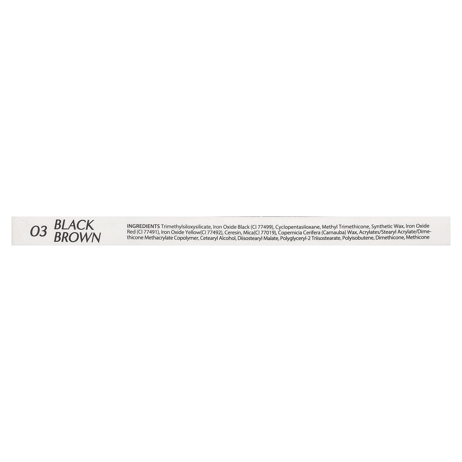 Trimetilsiloxisilicato, óxido de ferro preto (CI 77499), ciclopentasiloxano, methyl trimethicone, cera sintética, vermelho óxido de ferro (CI 77491), amarelo de óxido de ferro (CI 77492), ceresina, mica(CI 77019), cera de Copernicia cerifera (carnaúba), acrilatos/acrilato de estearilo/copolímero de metacrilato de dimeticona, álcool cetoestearílico, diisostearyl malate, polyglyceryl-2 triisostearate, poli-isobutileno, dimeticona, meticona.