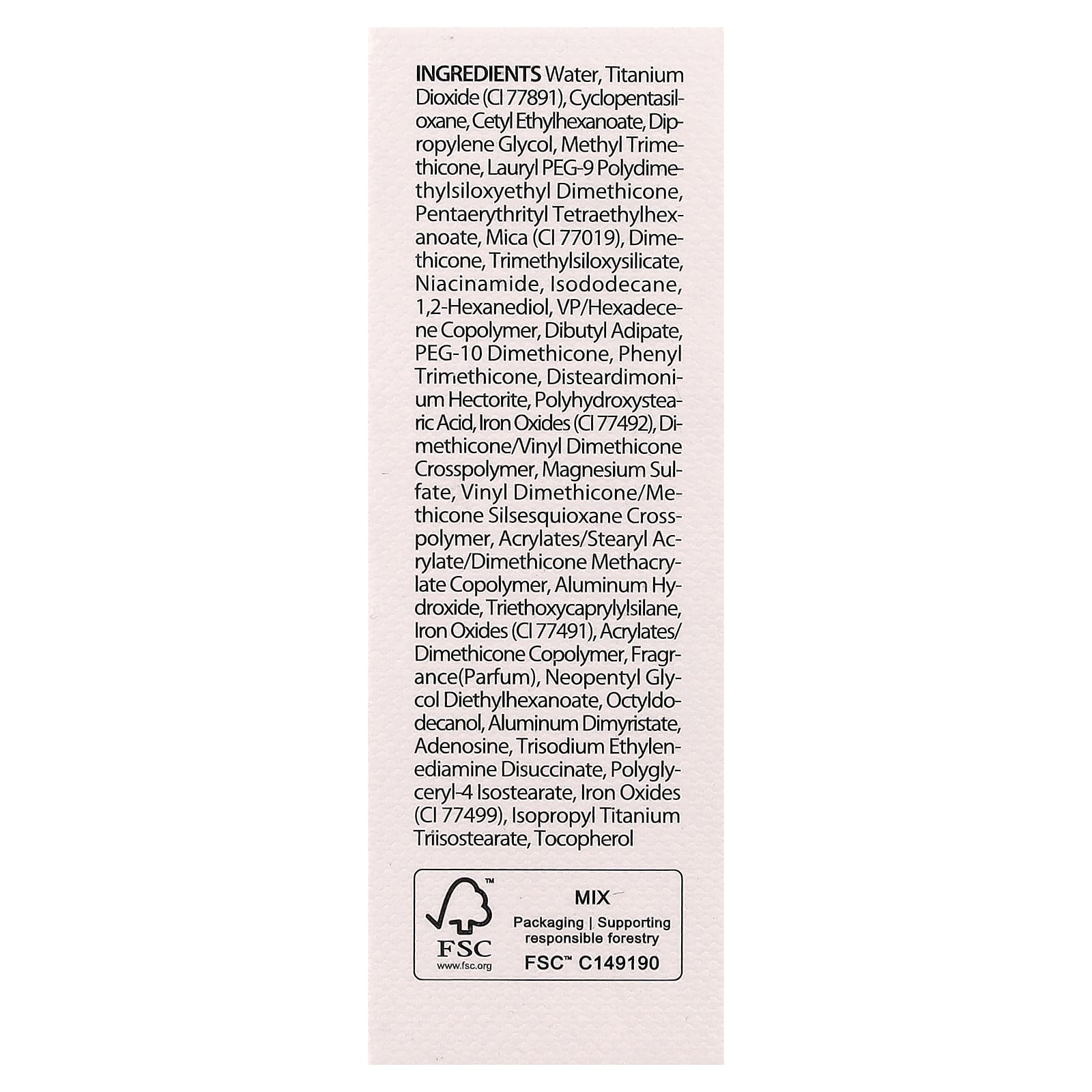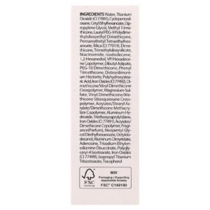 Água, dióxido de titânio (CI 77891), ciclopentasiloxano, etilcaproato de cetila, dimetildietilenoglicol, methyl trimethicone, lauryl peg-9 polydime thylsiloxyethyl dimethicone, pentaerythrityl tetraethylhexanoate, mica (CI 77019), dimeticona, trimethylsiloxysilicate, nicotinamida, isododecane, 1,2-hexanediol, vp/hexadecene copolymer, adipato de dibutila, peg-10 dimeticona, phenyl trimethicone, disteardimonium hectorite, ácido polihidroxiesteárico, óxidos de ferro (CI 77492), di-methicone/vinyl, crospolímero de dimeticona, sulfato de magnésio, vinyl dimethicone/methicone silsesquioxane crosspolymer, acrilatos/acrilato de estearilo/copolímero de metacrilato de dimeticona, hidróxido de alumínio, triethoxycaprylylsilane, óxidos de ferro (Cl 77491), acrilatos/copolímero de dimeticona, fragrância (perfume), neopentyl glycol diethylhexanoate, octildodecanol, aluminum dimyristate, adenosina, trisodium ethylenediamine disuccinate, polyglyceryl-4 isostearate, óxidos de ferro (CI 77499), isopropyl titanium triisostearate, tocoferol.