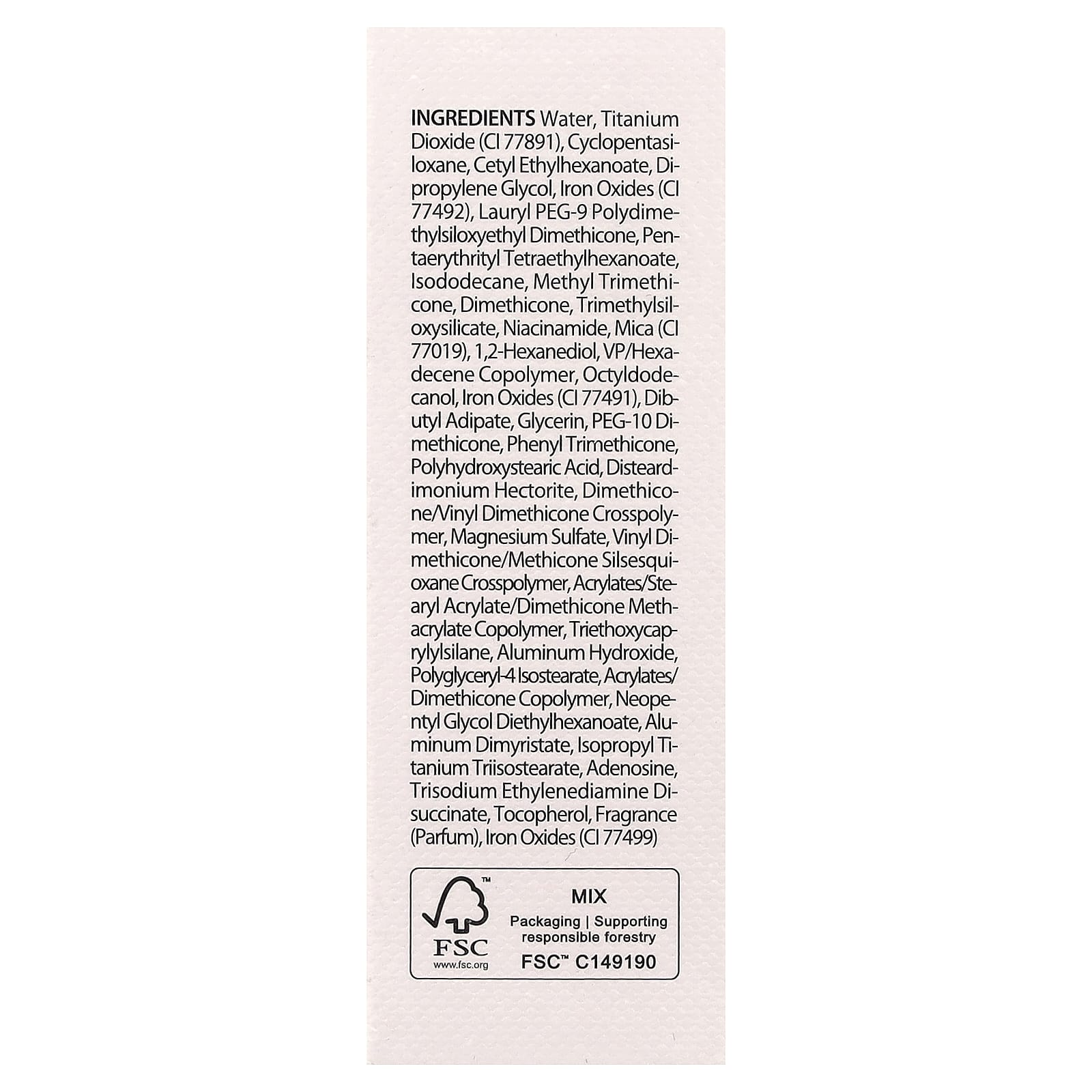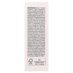 Água, dióxido de titânio (CI 77891), ciclopentasiloxano, etilcaproato de cetila, dimetildietilenoglicol, óxidos de ferro (CI 77492), lauryl peg-9 polydimethylsiloxyethyl dimethicone, pentaeritril tetraethylhexanoate, isododecane, methyl trimethicone, dimeticona, trimethylsiloxysilicate, nicotinamida, mica (CI 77019), 1,2-hexanediol, vp/hexadecene copolymer, octildodecanol, óxidos de ferro (CI 77491), adipato de dibutila, glicerina, peg-10 dimeticona, phenyl trimethicone, ácido polihidroxiesteárico, disteardimonium hectorite, dimethicone/vinyl dimethicone crosspolymer, sulfato de magnésio, vinyl dimethicone/methicone silsesquioxane crosspolymer, acrilatos/acrilato de estearilo/copolímero de metacrilato de dimeticona, triethoxycaprylylsilane, hidróxido de alumínio, polyglyceryl-4 isostearate, acrilatos/copolímero de dimeticona, neopentyl glycol diethylhexanoate, aluminum dimyristate, isopropyl titanium triisostearate, adenosina, trisodium ethylenediamine disuccinate, tocoferol, fragrância (perfume), óxidos de ferro (CI 77499).