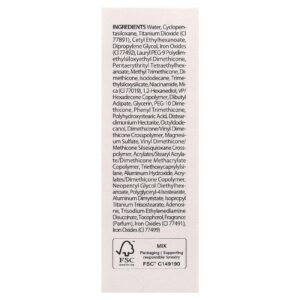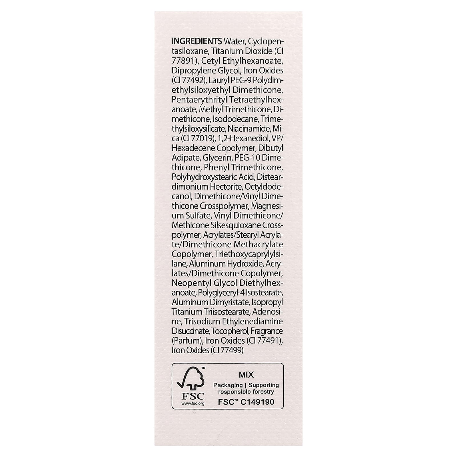 Água, ciclopentasiloxano, dióxido de titânio (CI 77891), etilcaproato de cetila, dimetildietilenoglicol, óxidos de ferro (CI 77492), lauryl peg-9 polydimethylsiloxyethyl dimethicone, pentaerythrityl tetraethylhexanoate, methyl trimethicone, dimeticona, isododecane, trimethylsiloxysilicate, nicotinamida, mica (CI 77019), 1,2-hexanediol, copolímero hexadeceno/vp, adipato de dibutila, glicerina, peg-10 dimeticona, phenyl trimethicone, ácido polihidroxiesteárico, disteardimonium hectorite, octildodecanol, dimethicone/vinyl dimethicone crosspolymer, sulfato de magnésio, vinyl dimethicone/methicone, silsesquioxane, crospolímero, acrilatos/acrilato de estearilo/copolímero de metacrilato de dimeticona, triethoxycaprylylsilane, hidróxido de alumínio, copolímero de acrilatos/dimeticona, neopentyl glycol diethylhexanoate, polyglyceryl-4 isostearate, aluminum dimyristate, isopropyl titanium triisostearate, adenosina, trisodium ethylenediamine disuccinate, tocoferol, fragrância (perfume), óxidos de ferro (CI 77491), óxidos de ferro (CI 77499).