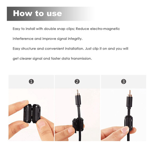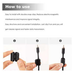Fácil de instalar com clipes duplos; reduz a interferência eletromagnética e melhora a integridade do sinal. Estrutura fácil e instalação conveniente. Basta cortá-lo e você obterá um sinal mais claro e uma transmissão de dados mais rápida.