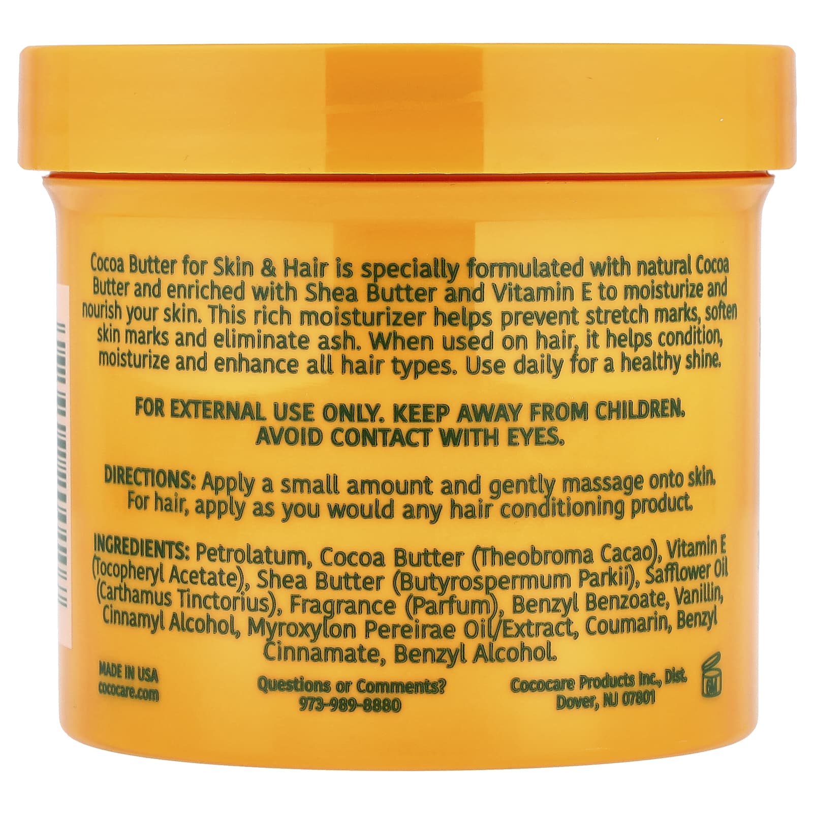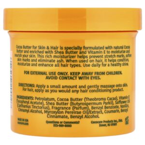 Manteiga de Cacau para a Pele & O Cabelo é especialmente formulado com Manteiga de Karité e Vitamina E para reparar a pele seca e danificada. Este hidratante rico ajuda a prevenir estrias, suavizar as marcas da pele e eliminar as cinzas. Quando usado no cabelo, ajuda a condicionar, hidratar e melhorar todos os tipos de cabelo. Use diariamente e você verá e sentirá a diferença.