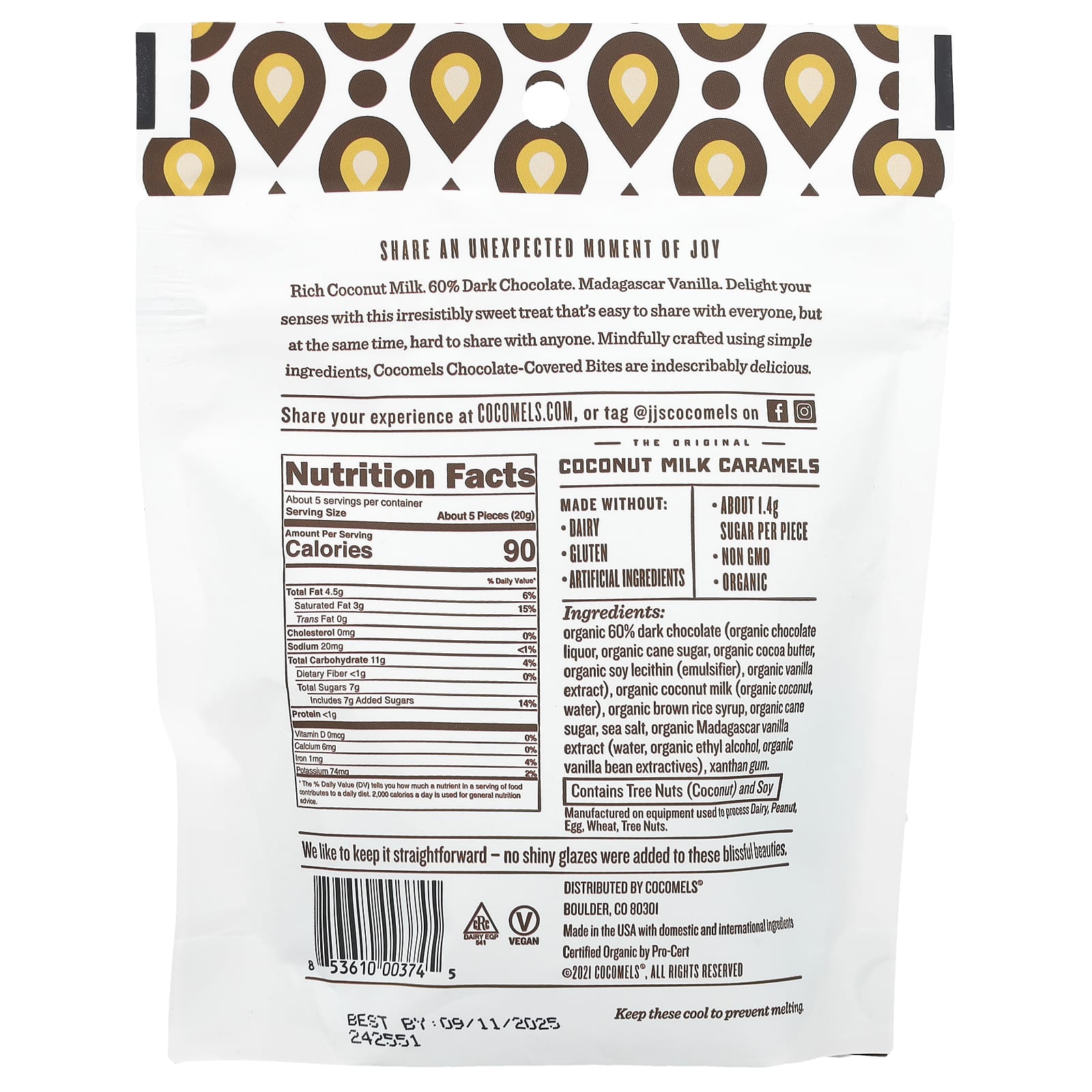 Leite de Coco Nutritivo. 60% de Chocolate Amargo. Baunilha de Madagascar. Delicie seus sentidos com esta guloseima irresistivelmente doce que é fácil de compartilhar com todos, mas, ao mesmo tempo, difícil de compartilhar com qualquer outra pessoa. Cuidadosamente elaborados com ingredientes simples, os Bites Cobertos com Chocolate Cocomels são indescritivelmente deliciosos.