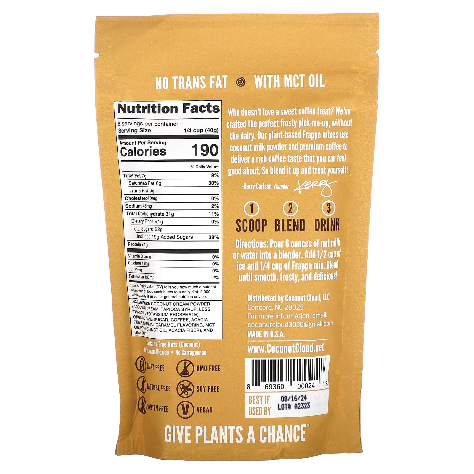 Creme de coco em pó (creme de coco, xarope de tapioca, menos de 2% de fosfato de potássio dibásico), açúcar de cana orgânico, café, fibra de acácia, sabor natural de caramelo, óleo TCM em pó (óleo TCM, fibra de acácia), e sal marinho.