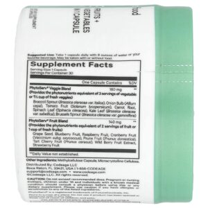 “Obtenha o equivalente em fitonutrientes encontrado em 5 porções de frutas e vegetais frescos em uma única cápsula.”