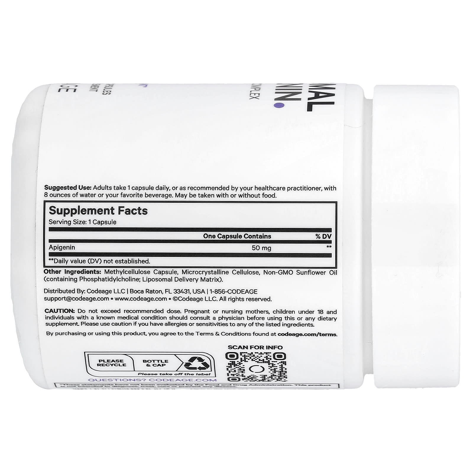 A Apigenina Lipossomal da CodeAge oferece 50 mg de apigenina de alta qualidade por dose, derivada do extrato de camomila, em uma abordagem ao bem-estar à base de plantas.