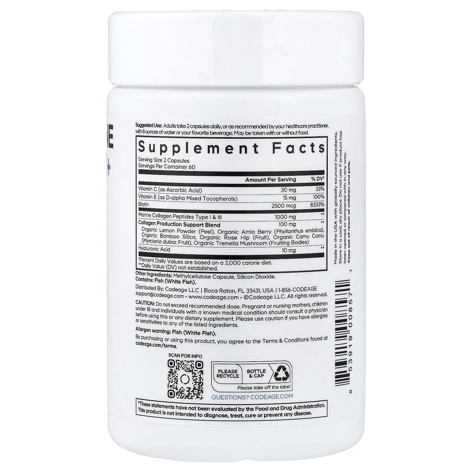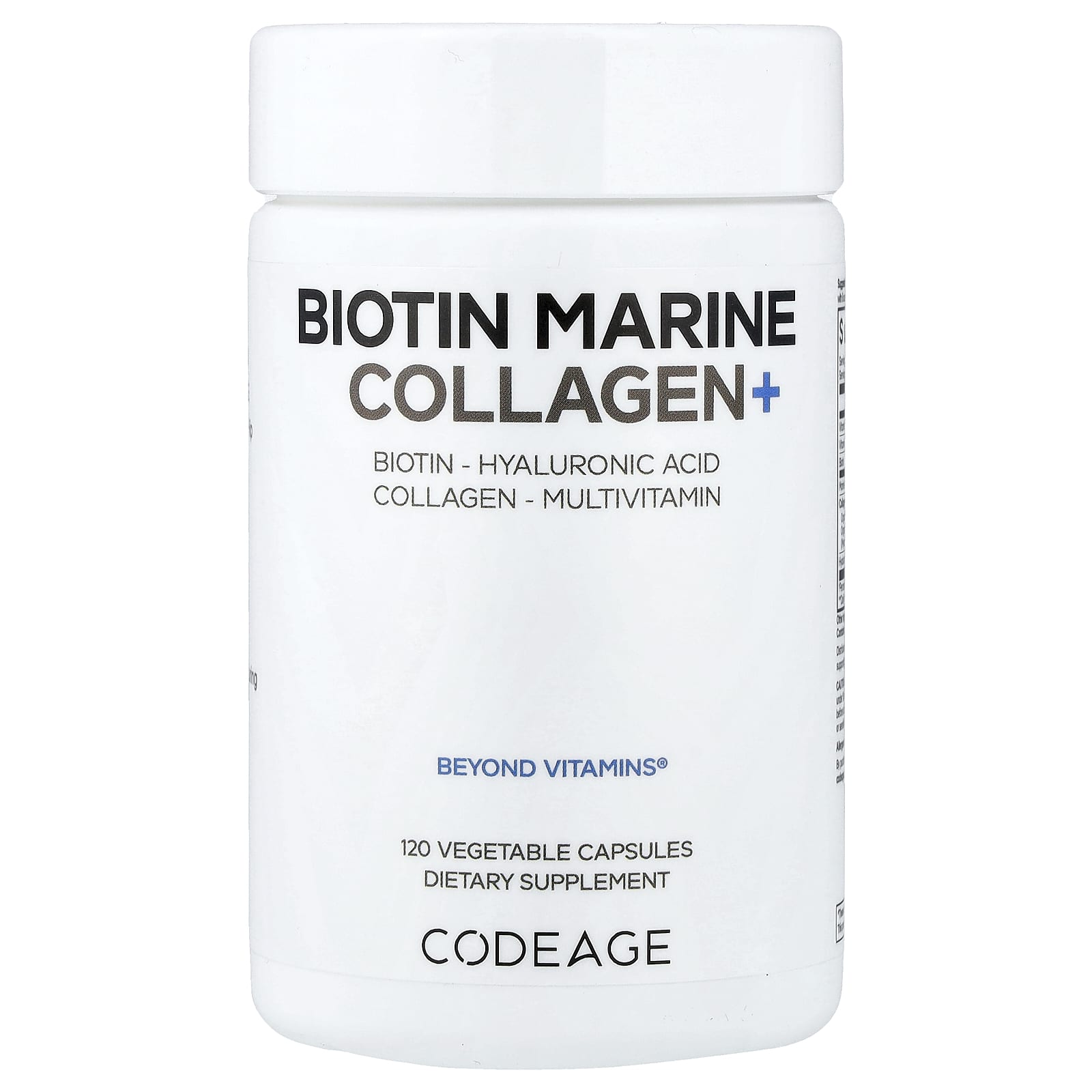 - Codeage Wild Caught Biotin Marine Collagen contém colágeno marinho do tipo 1 & 3 e biotina, uma vitamina B solúvel em água.