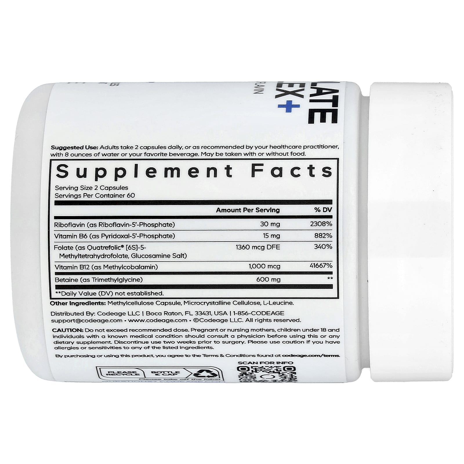 - A fórmula Complexo+ C com Metilfolato da CodeAge possui 1.360 mcg de vitaminas folato como folato de 5-MTHF por dose, usando o 5-metilfolato Quatrefolic® e sal de glicosamina.