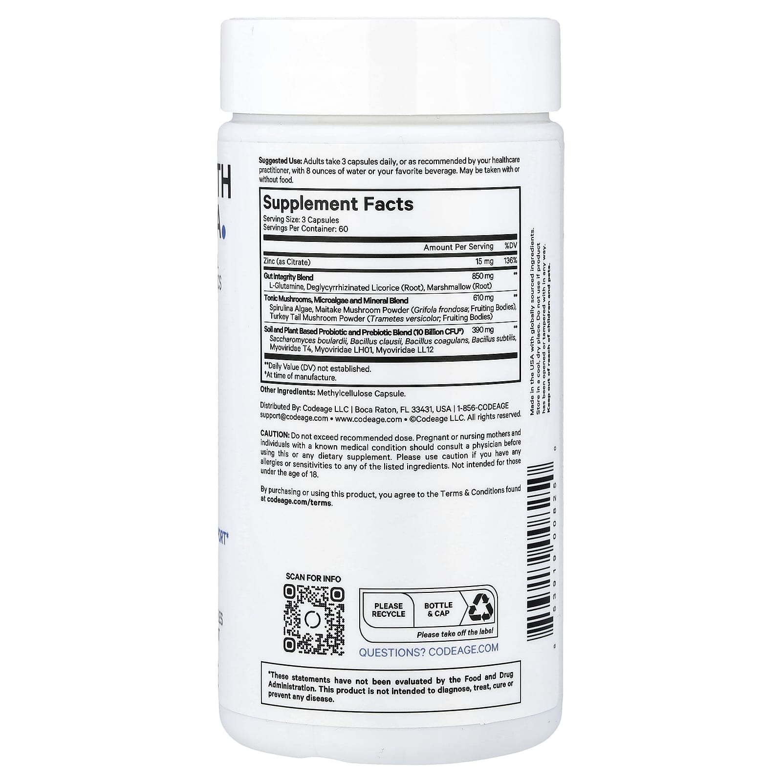 A Fórmula para a Saúde Intestinal da Codeage é um suplemento abrangente que combina Glutamina, probióticos, prebióticos, alcaçuz deglicirrizado, raiz de malva-branca, ervas adaptogênicas, microalgas, cogumelos tônicos e zinco.