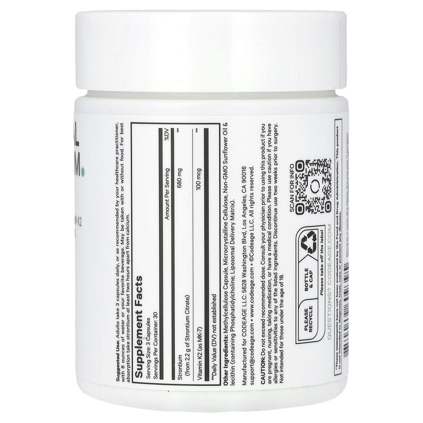 O suplemento de Estrôncio Lipossomal da CodeAge combina Citrato de Estrôncio biodisponível com Vitamina K2 (MK-7) para saúde óssea e suporte cardiovascular. Este suplemento de estrôncio também apresenta uma entrega lipossomal para ajudar a manter a biodisponibilidade de seus ingredientes.