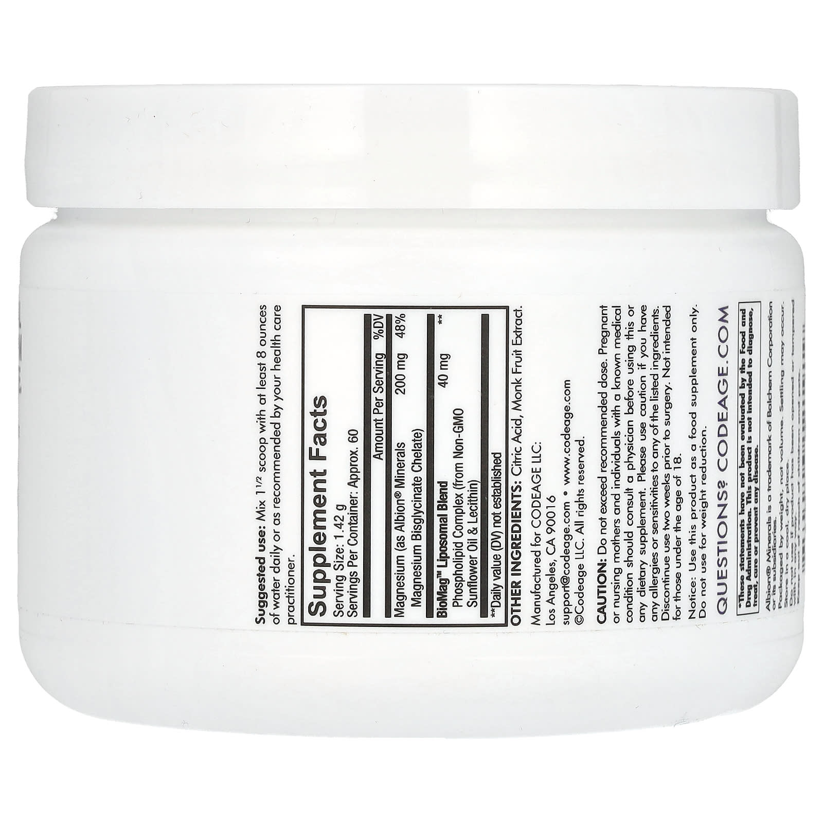 O suplemento de Glicinato de Magnésio Lipossomal em pó da Codeage oferece 200 mg de bisglicinato de magnésio quelato Albion® por dose e vem com um suprimento suficiente para 2 meses. Este pó de magnésio avançado também apresenta uma liberação lipossomal para ajudar a aumentar a absorção e promover efeitos calmantes e relaxamento.