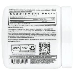 A Glutationa Lipossomal em Pó da CodeAge oferece uma abordagem avançada com 1.000 mg de L-Glutationa em pó reduzida por dose em uma mistura patenteada. Esta fórmula em pó inclui um fornecimento lipossomal com um complexo de fosfolipídios. Suprimento para 2 Meses.
