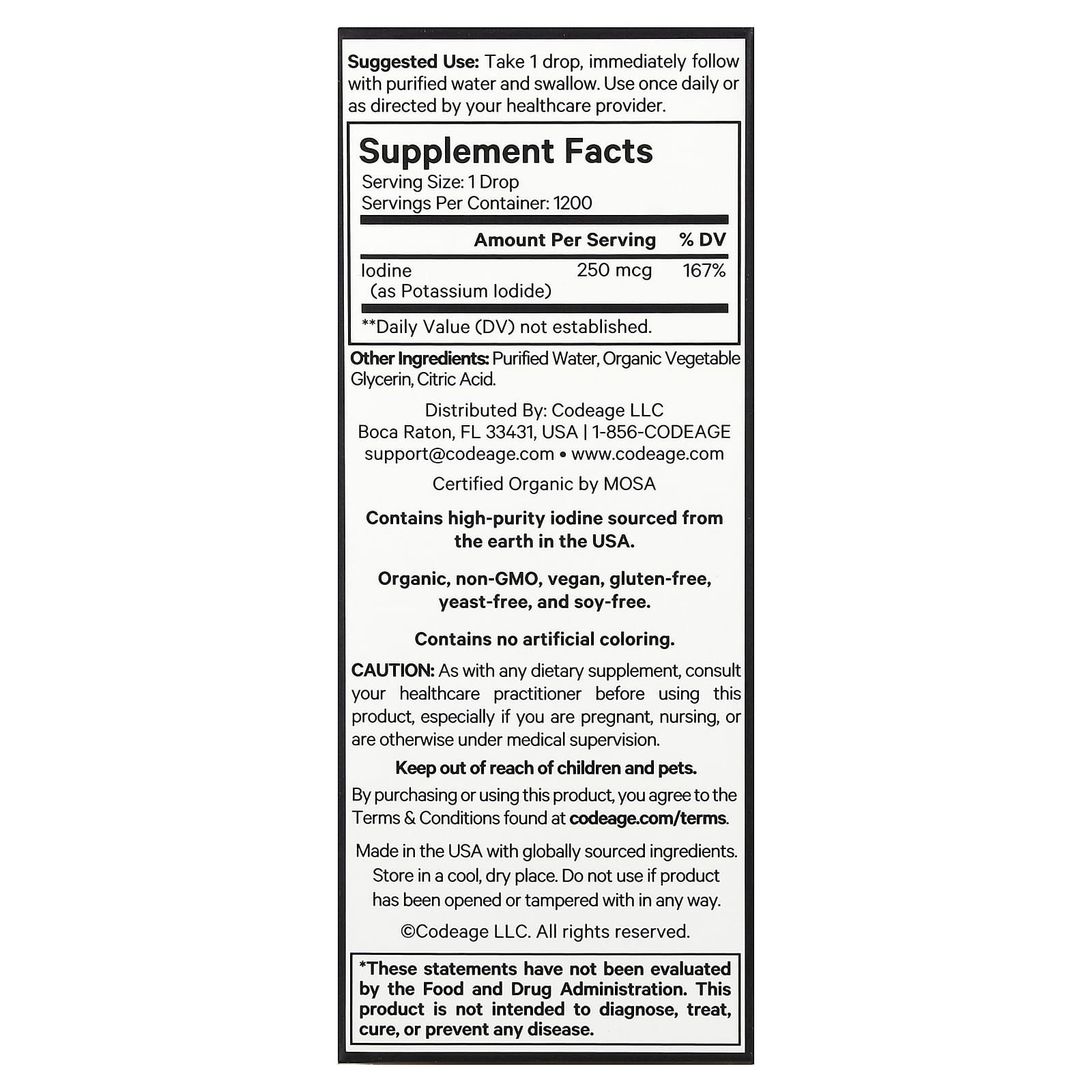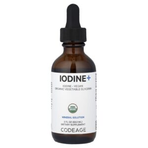 CodeAge Iodine+ é um suplemento de iodo líquido com gotas de iodo mineral orgânico para ajudar a apoiar a função da tireoide, o metabolismo e os níveis de energia. Orgânico certificado pelo USDA, este suplemento vegano de iodo oferece 1.200 porções por frasco por mais de um ano de fornecimento.