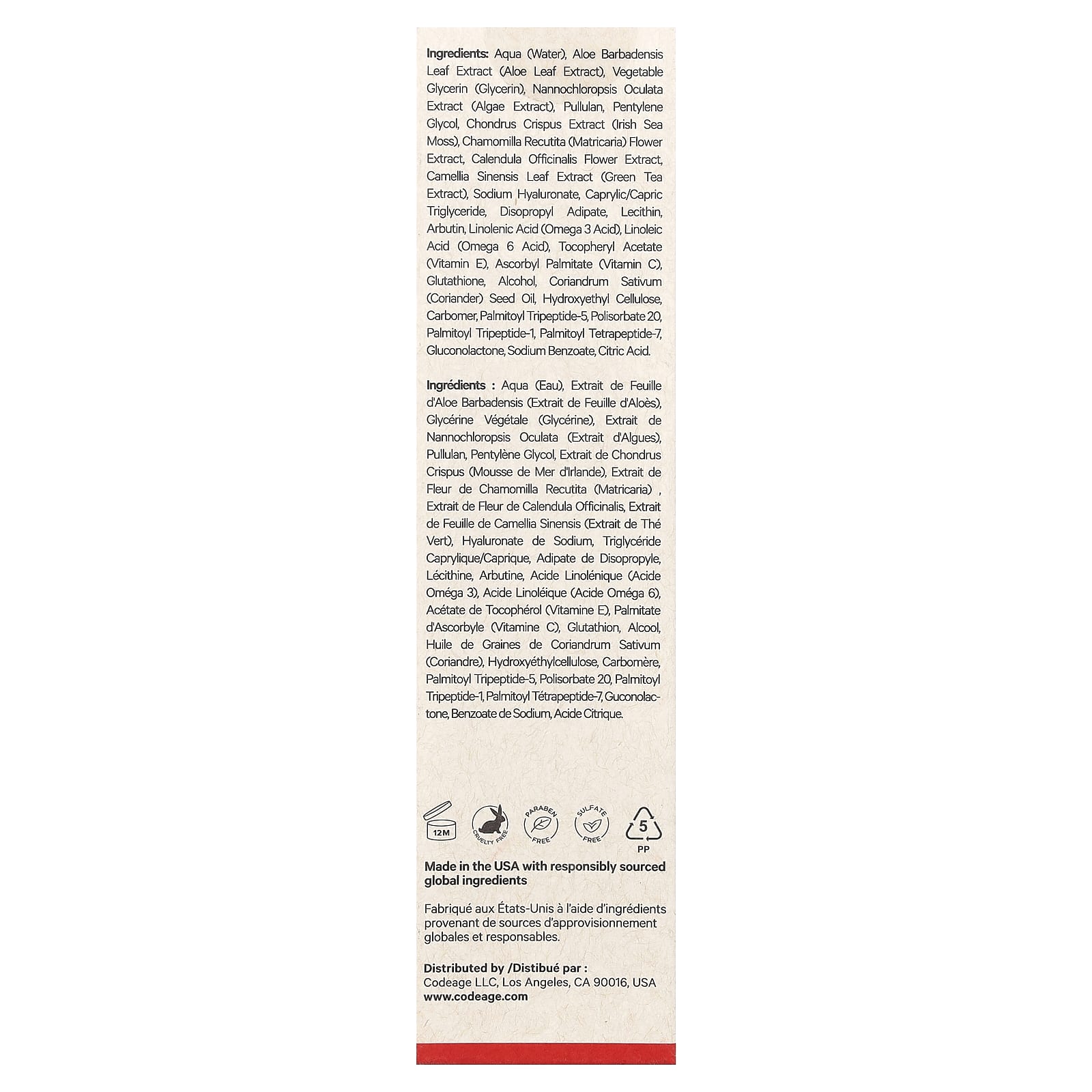 Aqua (água), extrato da folha de Aloe barbadensis (extrato da folha de aloe), glicerina vegetal (glicerina), extrato de Nannochloropsis oculata (extrato de algas), pullulan, pentilenoglicol, extrato de Chondrus crispus (musgo marinho da Irlanda), extrato da flor de Chamomilla recutita (matricária), extrato da flor de Calendula officinalis, extrato da folha de Camellia sinensis (extrato de chá verde), hialuronato de sódio, caprylic/capric triglyceride, adipato de desopropila, lecitina, arbutin, ácido linolênico (ácido ômega-3), ácido linoleico (ácido ômega 6), acetato de racealfatocoferol (vitamina E), palmitato de ascorbila (vitamina C), glutationa, álcool, óleo da semente de Coriandrum sativum (coentro), hietelose, carbômero, palmitoyl tripeptide-5, polissorbato 20, palmitoyl tripeptide-1, palmitoyl tetrapeptide-7, gluconolactone, benzoato de sódio, ácido cítrico.