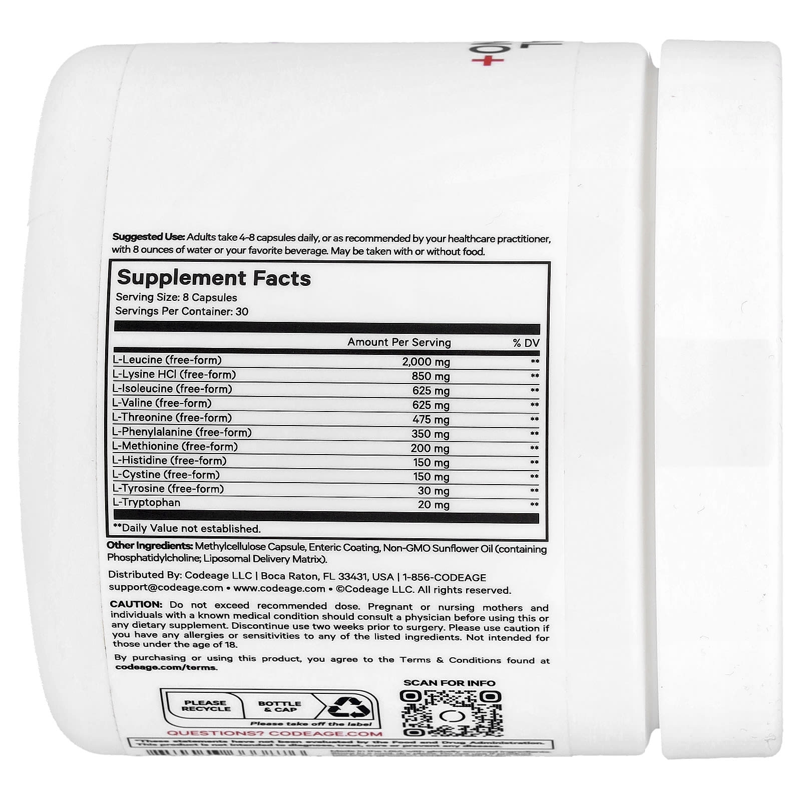 - Este suplemento de BCAA em pó (aminoácido de cadeia ramificada) e EAA em pó (aminoácido essencial) utiliza uma entrega lipossomal. A fórmula do suplemento EAA da Codeage fornece L-Leucina, Cloridrato de L-Lisina, L-Isoleucina, L-Valina, L-Treonina, L-Fenilalanina, L-Metionina, L-Histidina, L-Cistina, L-Tirosina em sua forma livre , bem como L-Triptofano.