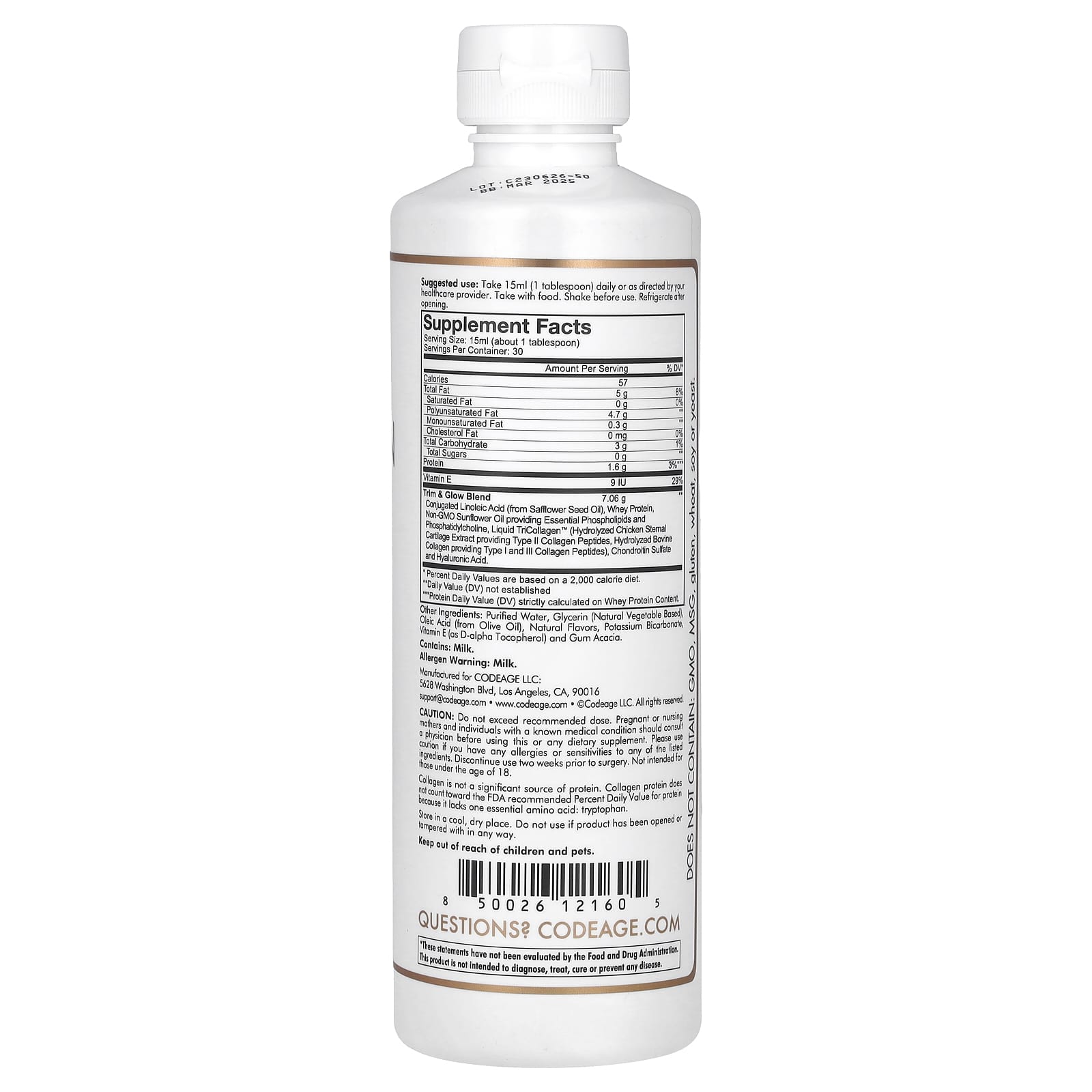 Experimente o Colágeno Líquido Nanoalimentos Trim & Glow da CodeAge, um suplemento moderno de colágeno líquido com ácido hialurônico, CLA, vitamina E e mais ingredientes para ajudar a reforçar a pele, as articulações e o cabelo. Este colágeno líquido vem com uma entrega lipossomal para biodisponibilidade e absorção.