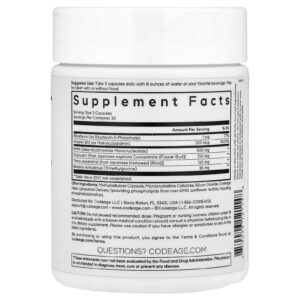 Cápsula de metilcelulose, celulose microcristalina, dióxido de silício, entrega lipossomal CodeAge (fornecendo fosfolipídios de lecitina de girassol não OGM, incluindo fosfatidilcolina).