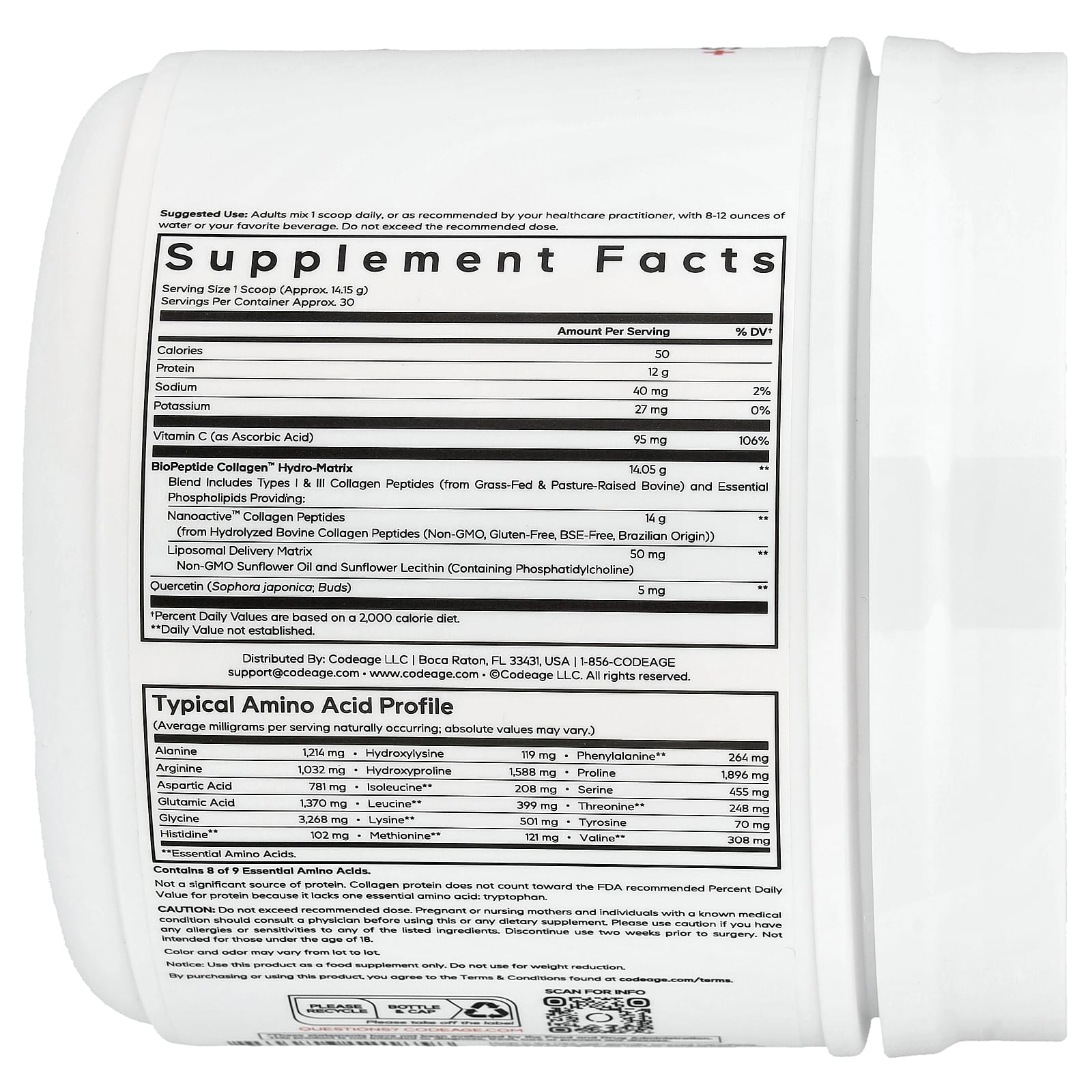 Codeage Peptídeos de Colágeno Lipossomal+ em Pó Sem Sabor 4245 g (1497 oz) – Codeage Suplementos Ossos, Articulações e Cartilagem Colágeno, Suplementos Vitaminas Vitamina C.