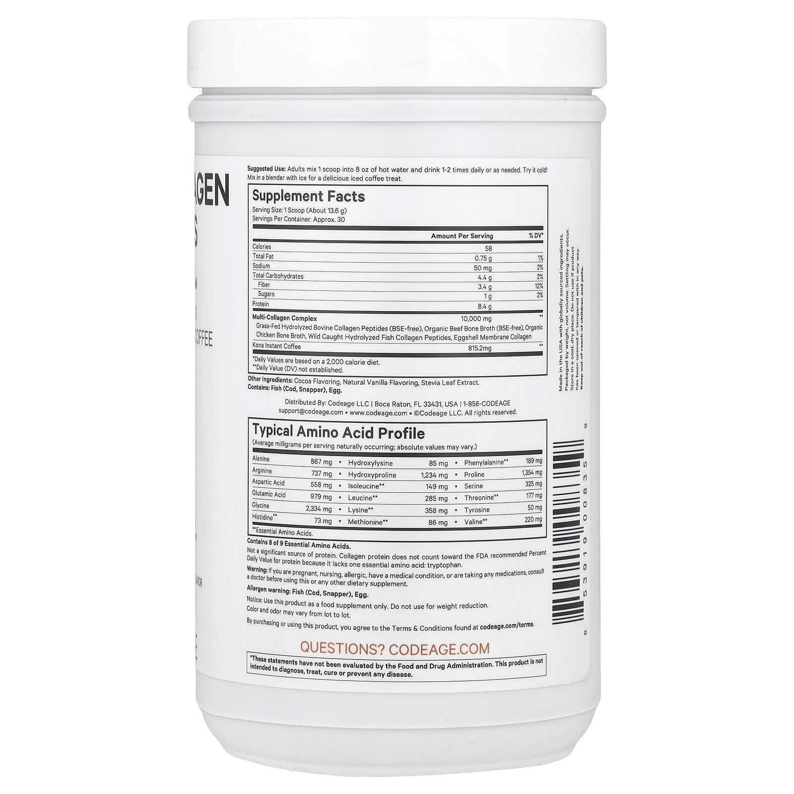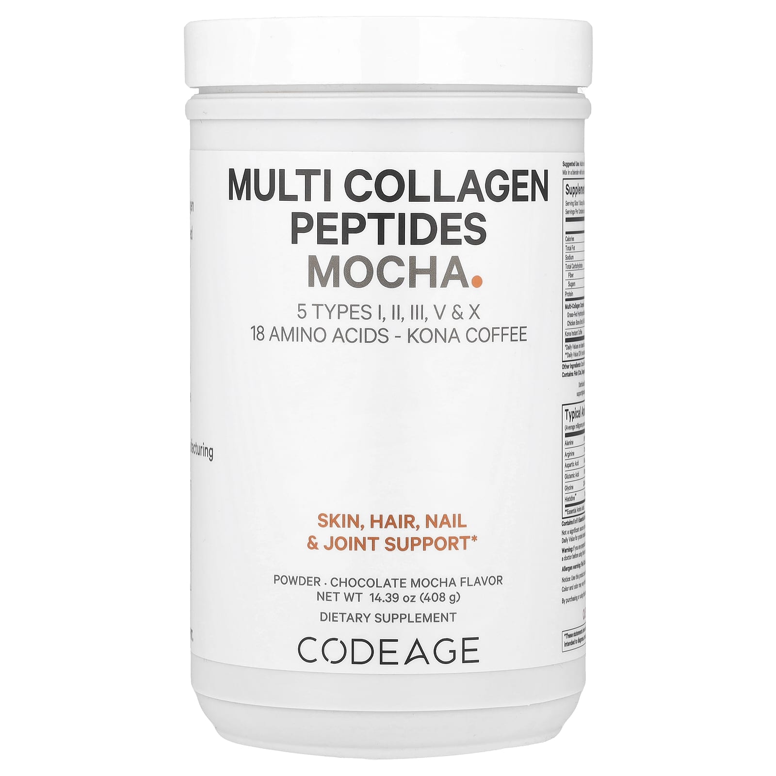 O Mocha de Peptídeos de Multicolágeno da Codeage combina a riqueza do café Kona com uma fórmula multicolágeno com cinco tipos de colágeno (I, II, III, V e X). Esta mistura de café instantâneo tem como objetivo aprimorar sua rotina matinal e refrescar as tardes com um delicioso sabor de mocha.