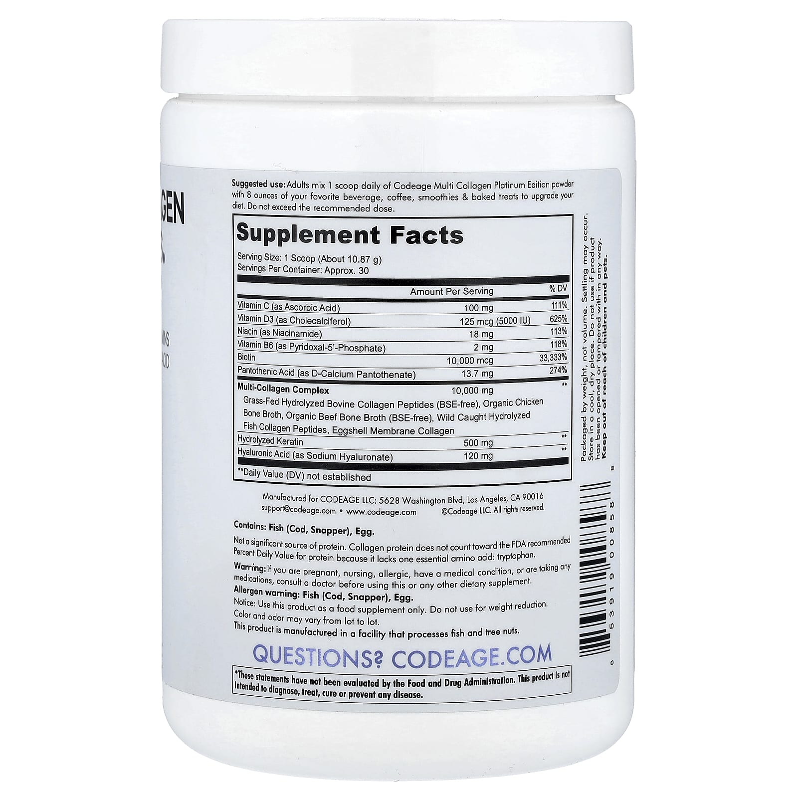 O Multicolágeno em Pó Platinum da CodeAge é um suplemento de colágeno em pó de alta qualidade que combina 5 tipos de peptídeos de colágeno com 10.000 mcg de biotina, queratina hidrolisada, vitaminas B6, C e D3, ácido hialurônico, ácido pantotênico, ácido nicotínico e 18 aminoácidos em uma fórmula abrangente.
