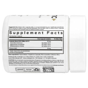 GLP-1 Probiotic+® da Codeage contém uma mistura de probióticos vivos, incluindo Clostridium butyricum, Akkermansia muciniphila e Bifidobacterium infantis, combinados com o prebiótico inulina de chicória.