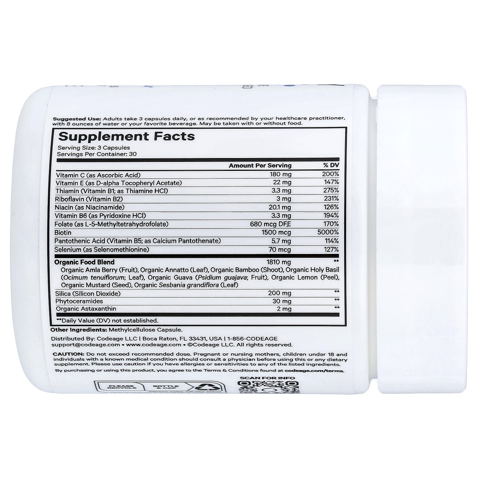 Além da biotina, esta fórmula contém vitaminas C e E integrais, fitoceramidas e astaxantina orgânica, junto com selênio, tiamina, riboflavina (B1 e B2), ácido pantotênico (B5), vitamina B6 (piridoxina) e folato.