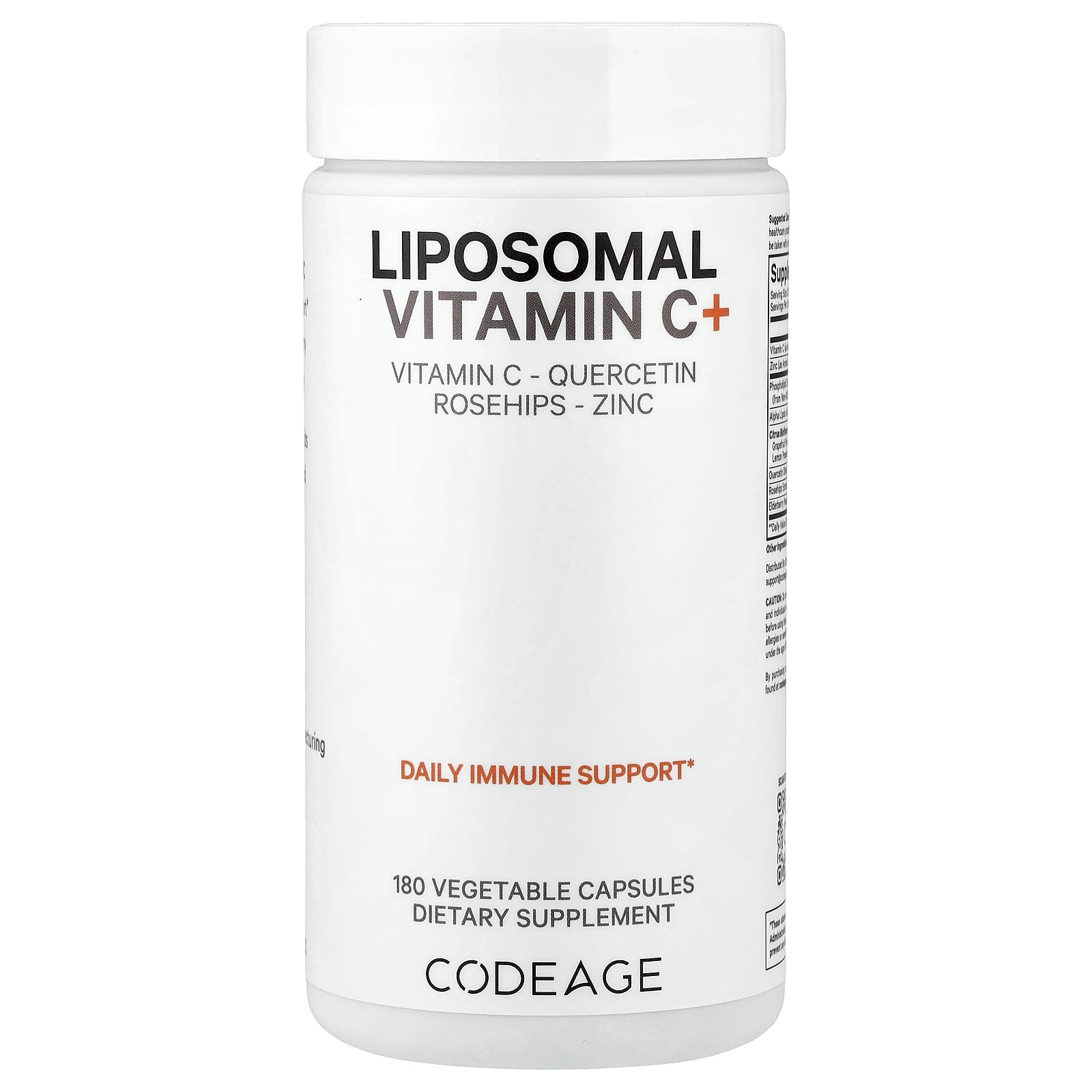 A Vitamina C+ Lipossomal da CodeAge é um suplemento de alta potência. Ela contém 1.500 mg de vitamina C, bioflavonoides cítricos, quercetina, sabugueiro, rosa-mosqueta, zinco e ácido tióctico. Esta fórmula avançada em cápsulas de vitamina C também apresenta um fornecimento lipossomal.