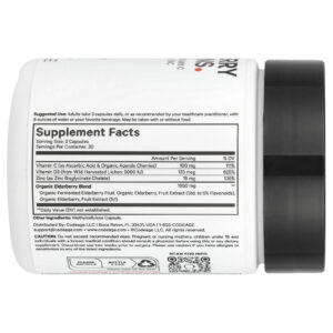 Mistura orgânica e vegana de suplemento de sabugueiro com vitamina C, vitamina D3 e zinco em uma única cápsula fácil de usar.